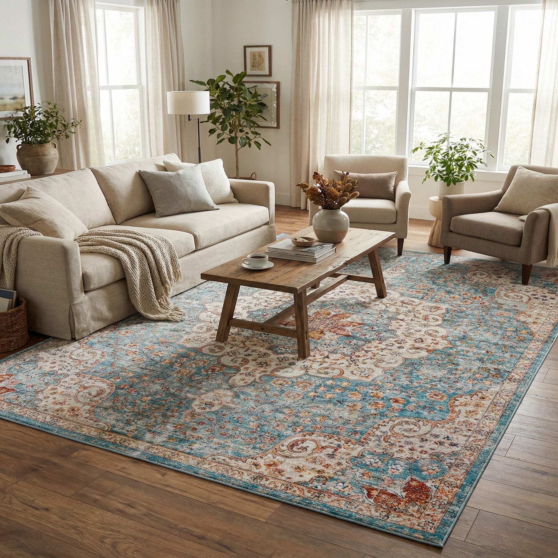 Primary color is Blue. Colors in this rug include: Blue, Ivory, Light Blue, Rust Red, Terracotta.
