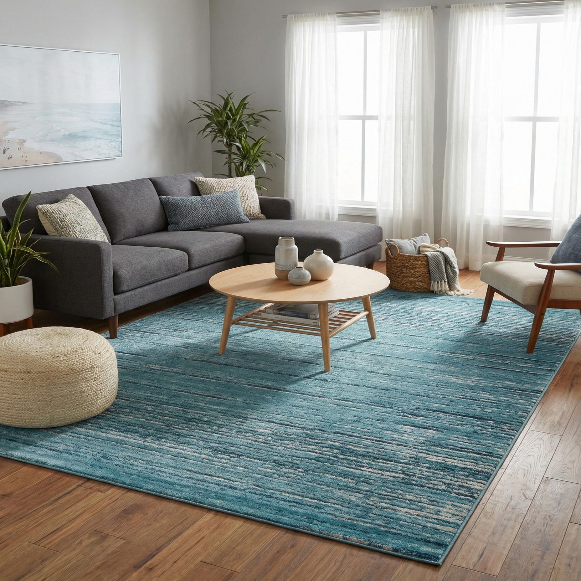 Primary color is Blue. Colors in this rug include: Blue, Gray, Ivory, Navy Blue.