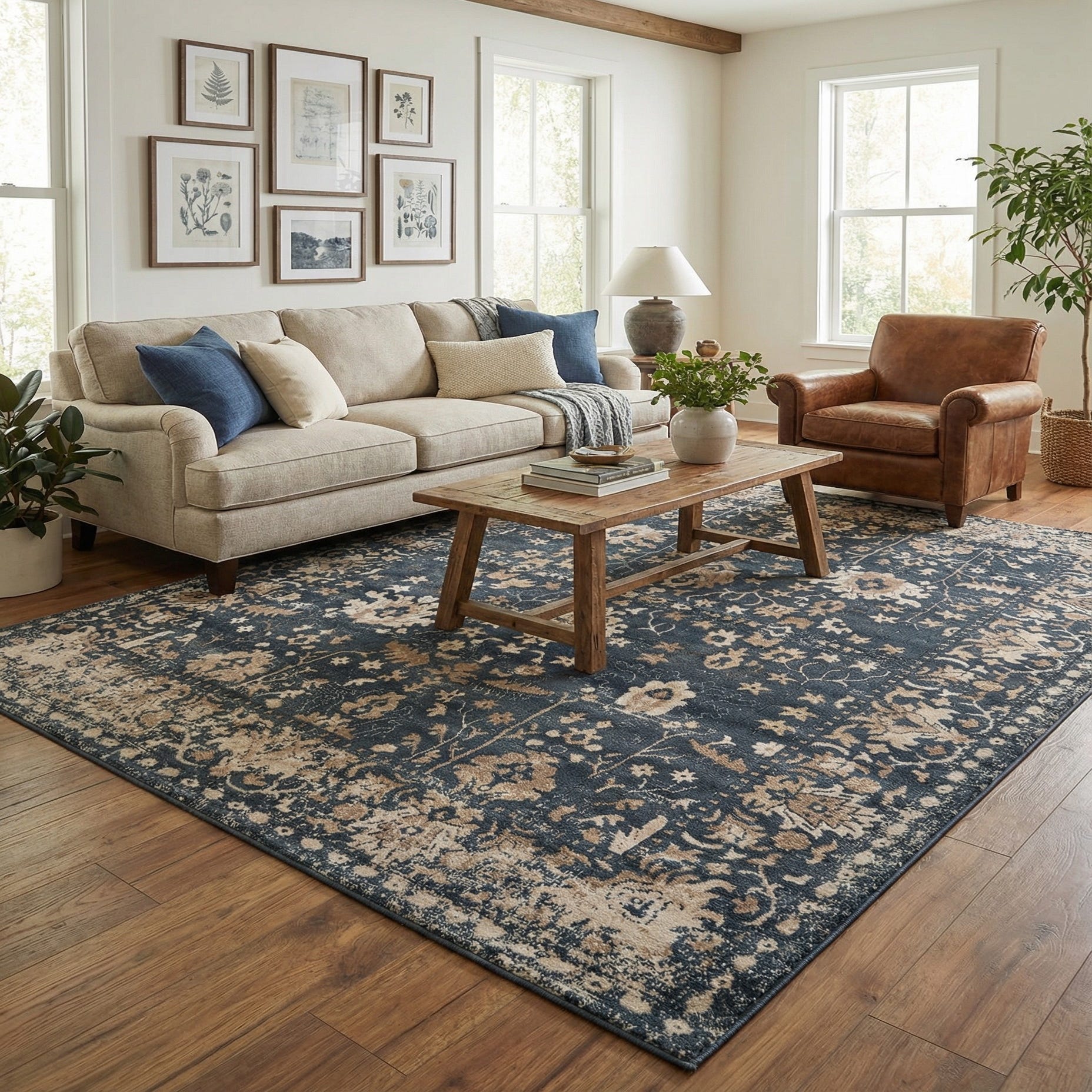 Primary color is Blue. Colors in this rug include: Blue, Beige, Ivory, Light Brown.