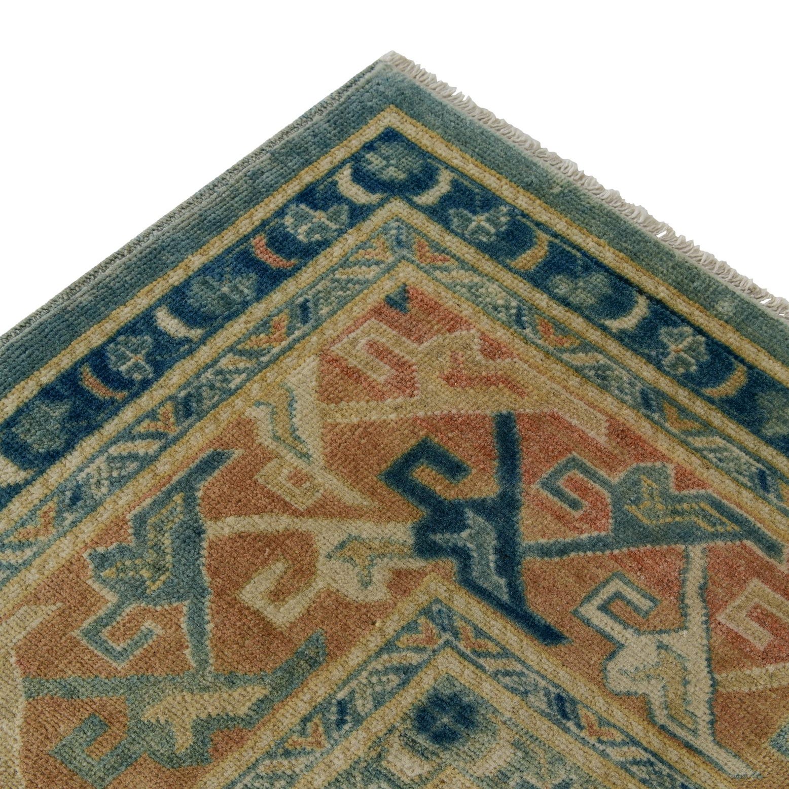 Primary color is Blue. Colors in this rug include: Blue, Beige, Light Brown, Ivory, Navy Blue.