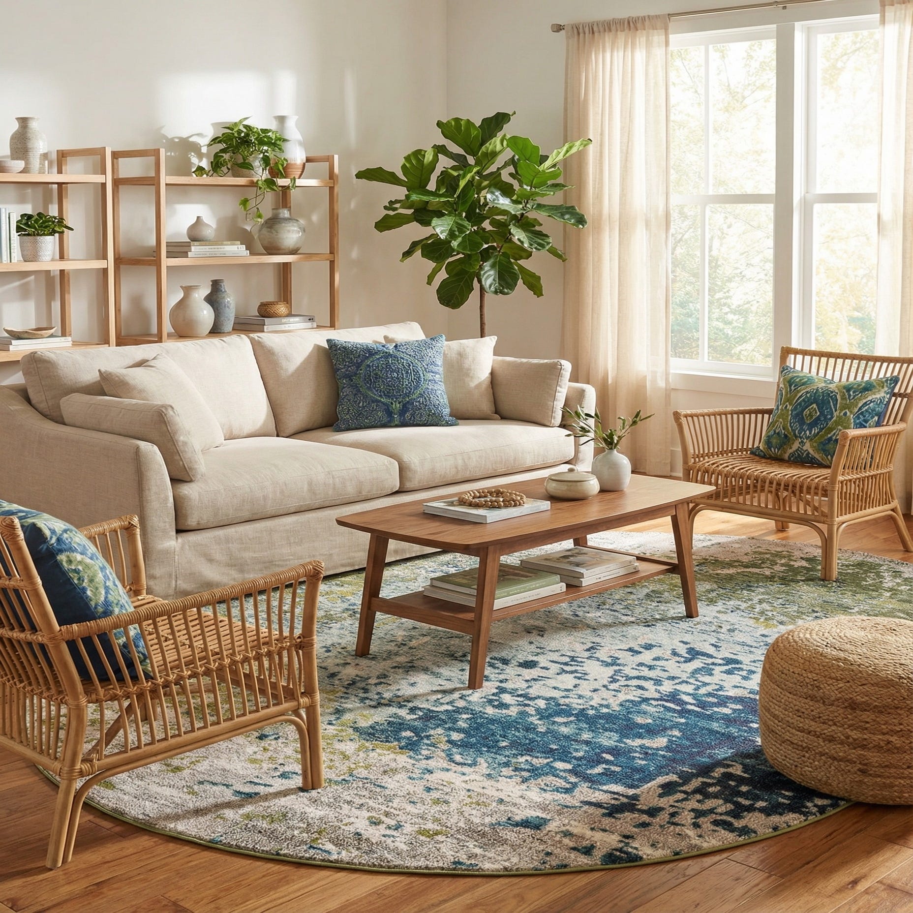 Primary color is Blue. Colors in this rug include: Blue, Gray, Green, Navy Blue, Light Blue, Yellow.