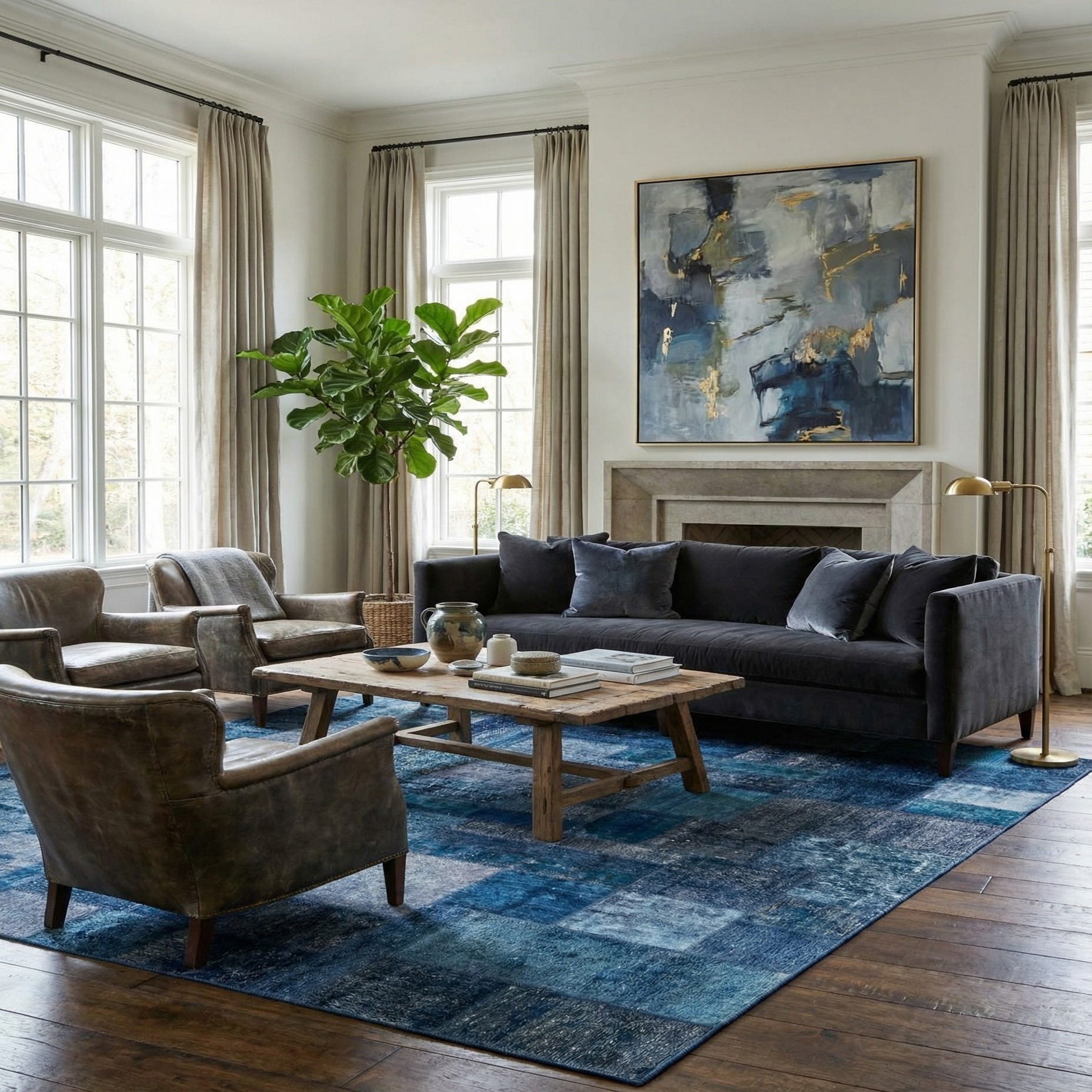 Primary color is Blue. Colors in this rug include: Blue, Ivory, Navy Blue, Purple, Black.