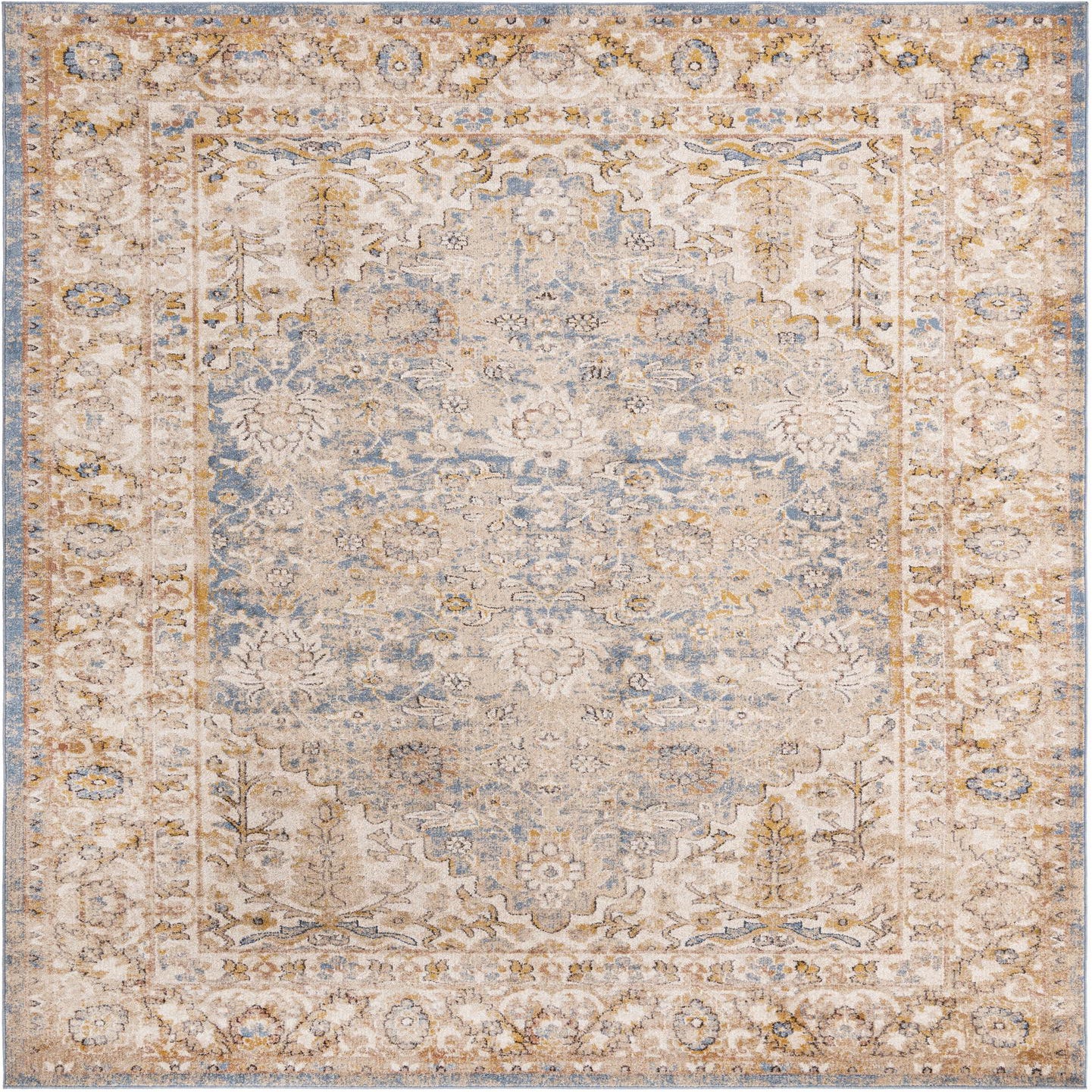 Primary color is Blue. Colors in this rug include: Blue, Beige, Ivory, Gray, Black.
