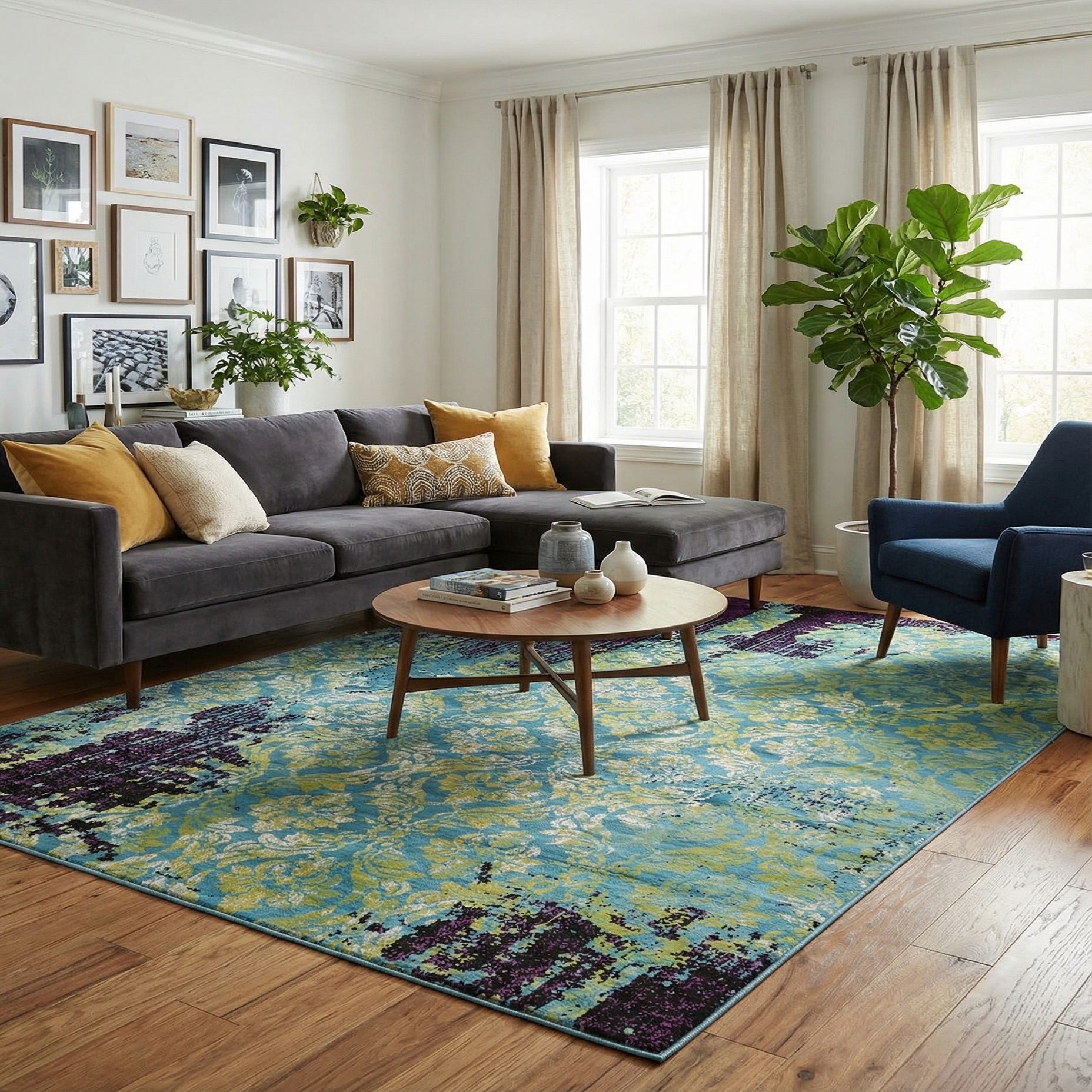 Primary color is Blue. Colors in this rug include: Blue, Black, Light Green, Violet, Ivory.