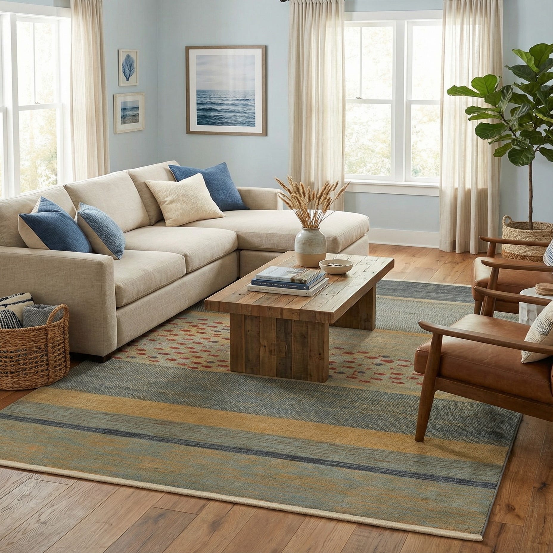 Primary color is Blue. Colors in this rug include: Blue, Light Blue, Beige, Red.