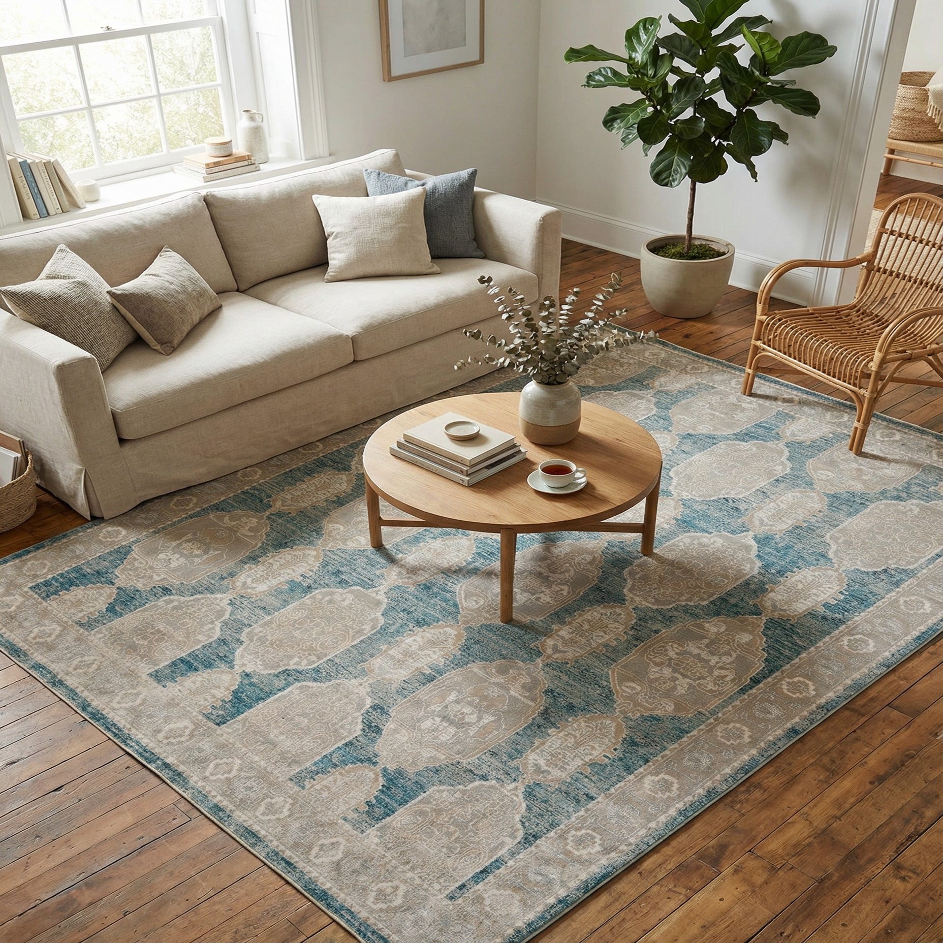 Primary color is Blue. Colors in this rug include: Blue, Ivory, Light Blue, Gray, Beige.
