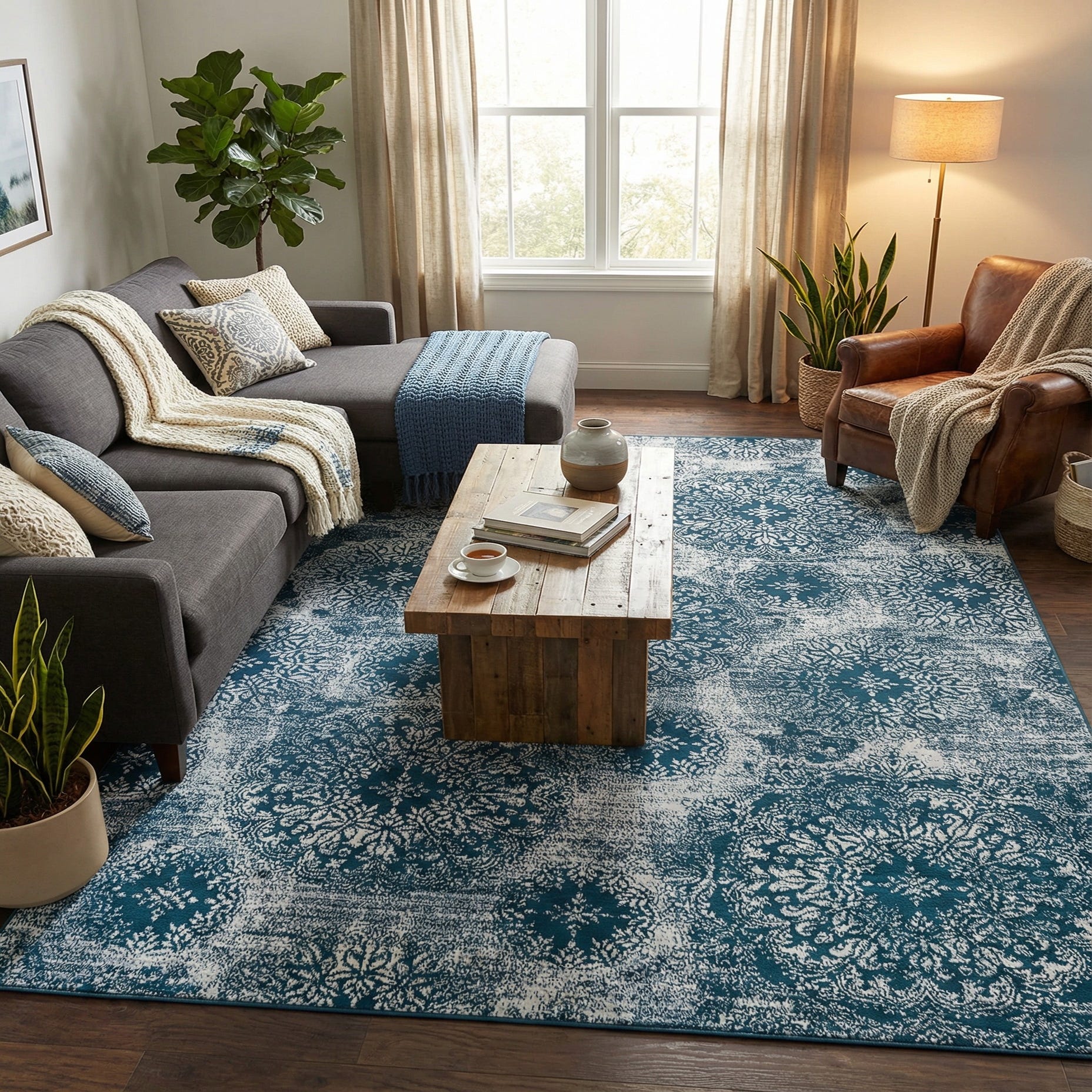 Primary color is Blue. Colors in this rug include: Blue, Ivory.