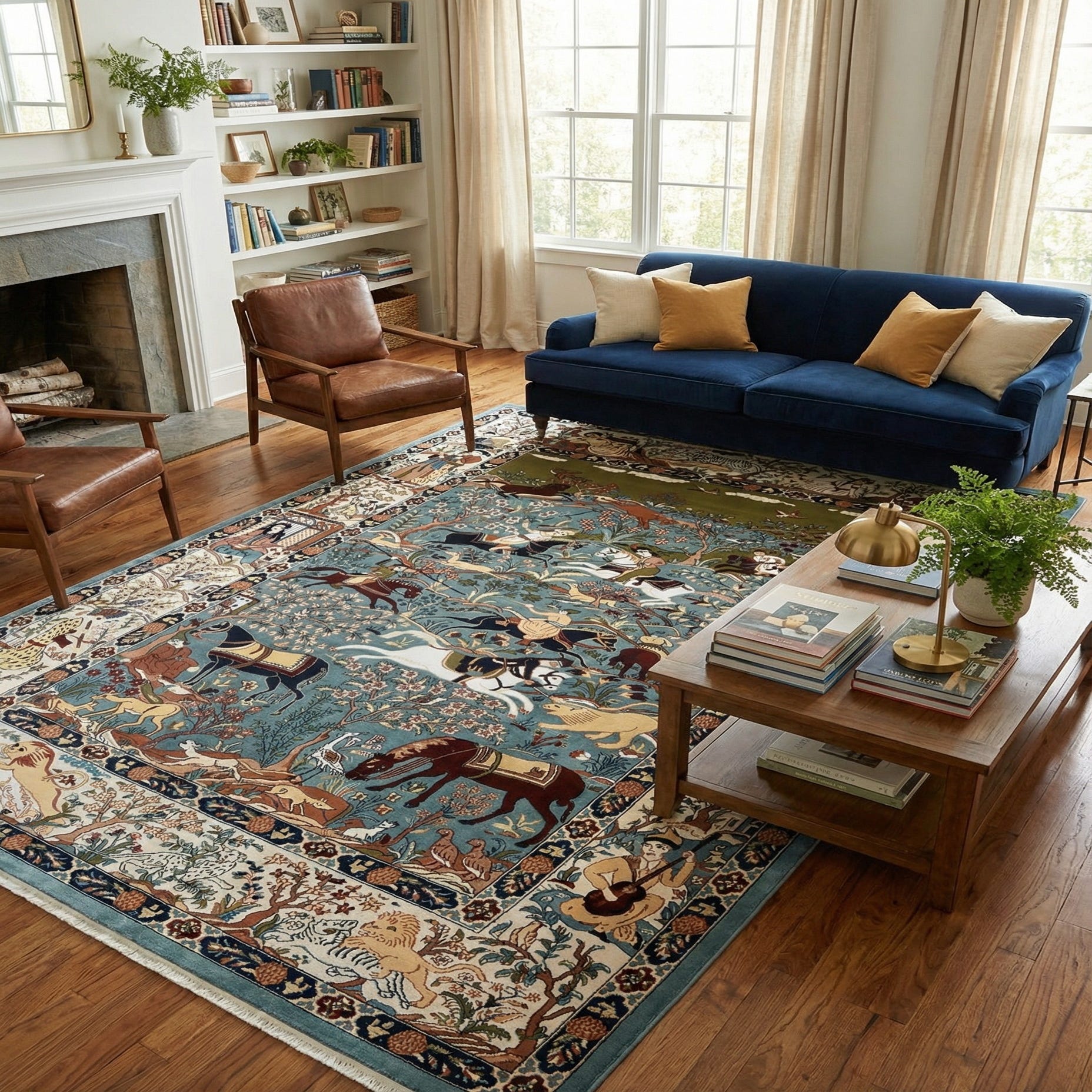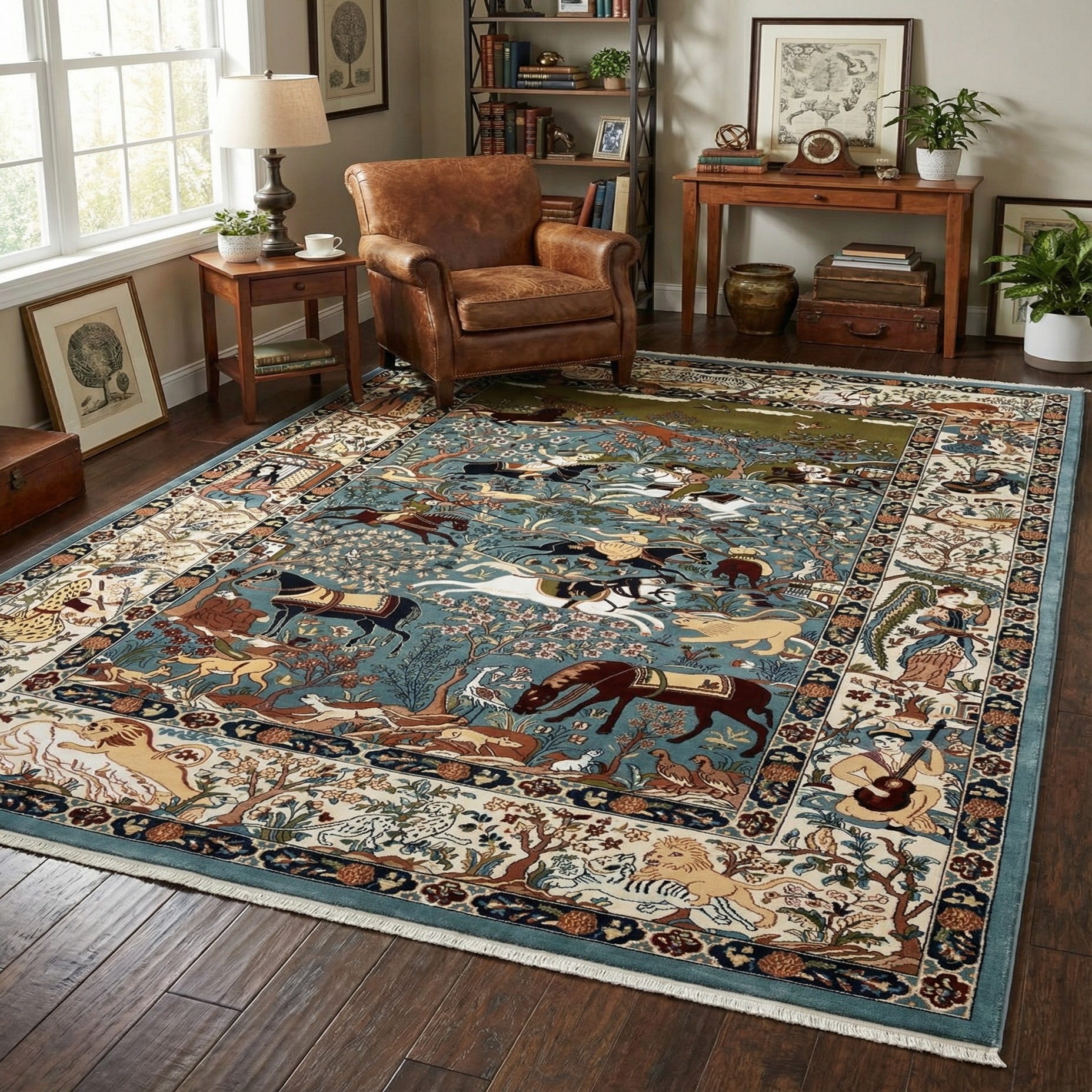 Primary color is Blue. Colors in this rug include: Blue, Burgundy, Cream, Green, Ivory, Navy Blue, Tan, Plum Red.