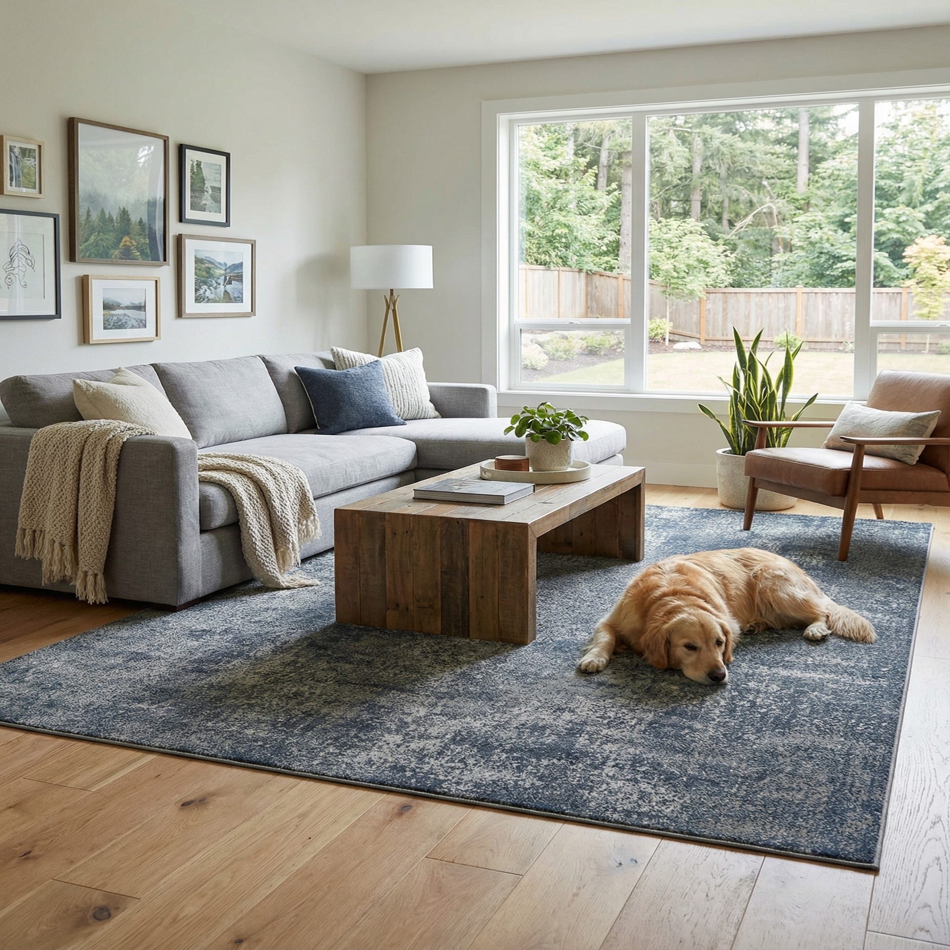 Primary color is Blue. Colors in this rug include: Blue, Gray, Ivory.