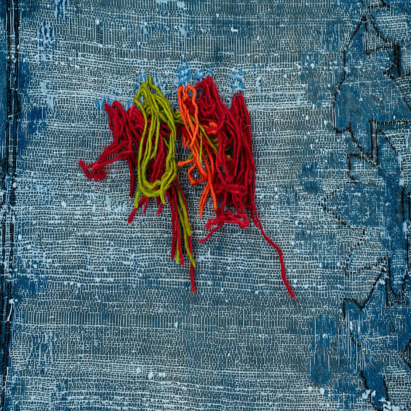 Primary color is Blue. Colors in this rug include: Blue, Ivory, Navy Blue, Orange, Red, Green.