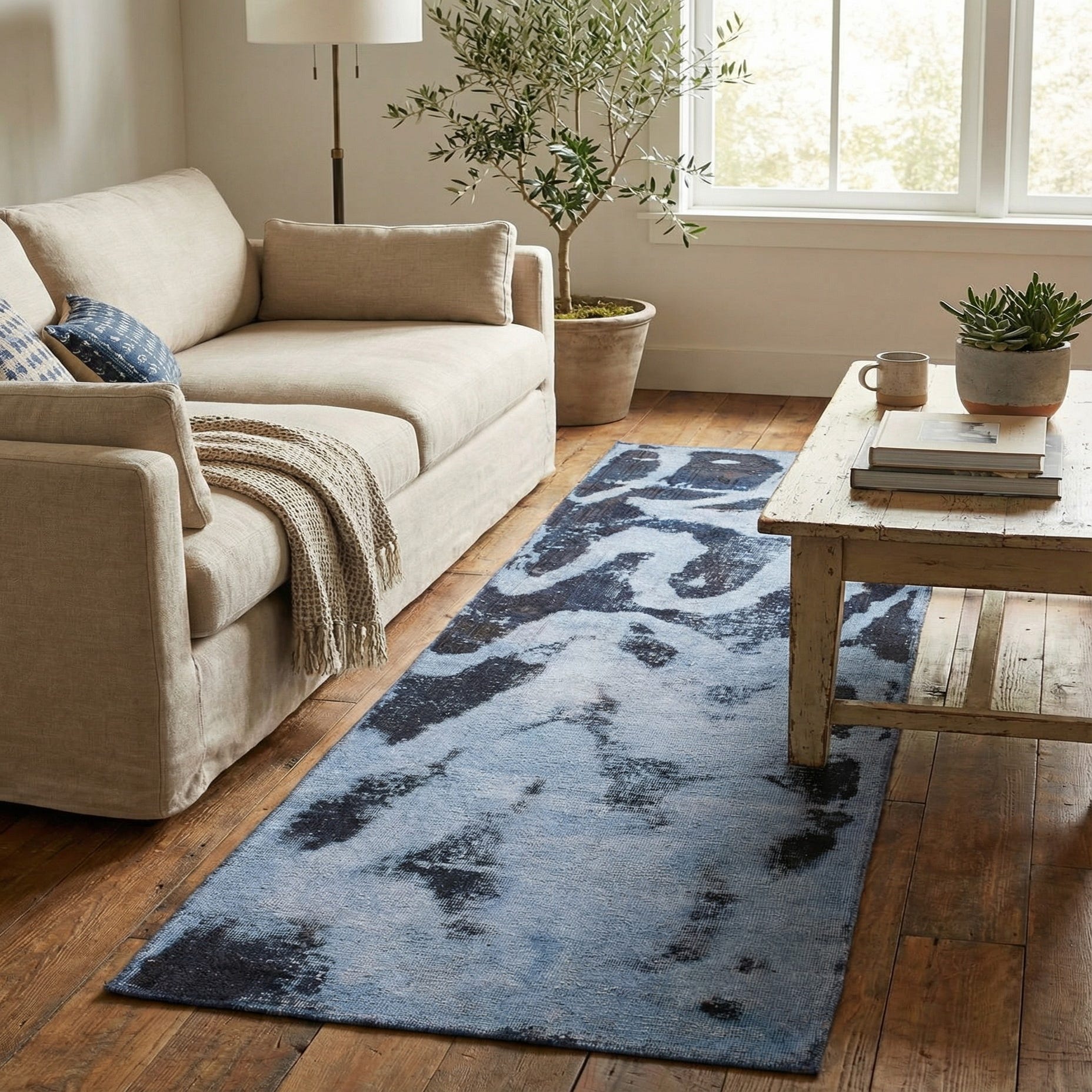 Primary color is Blue. Colors in this rug include: Blue, Black, Navy Blue.