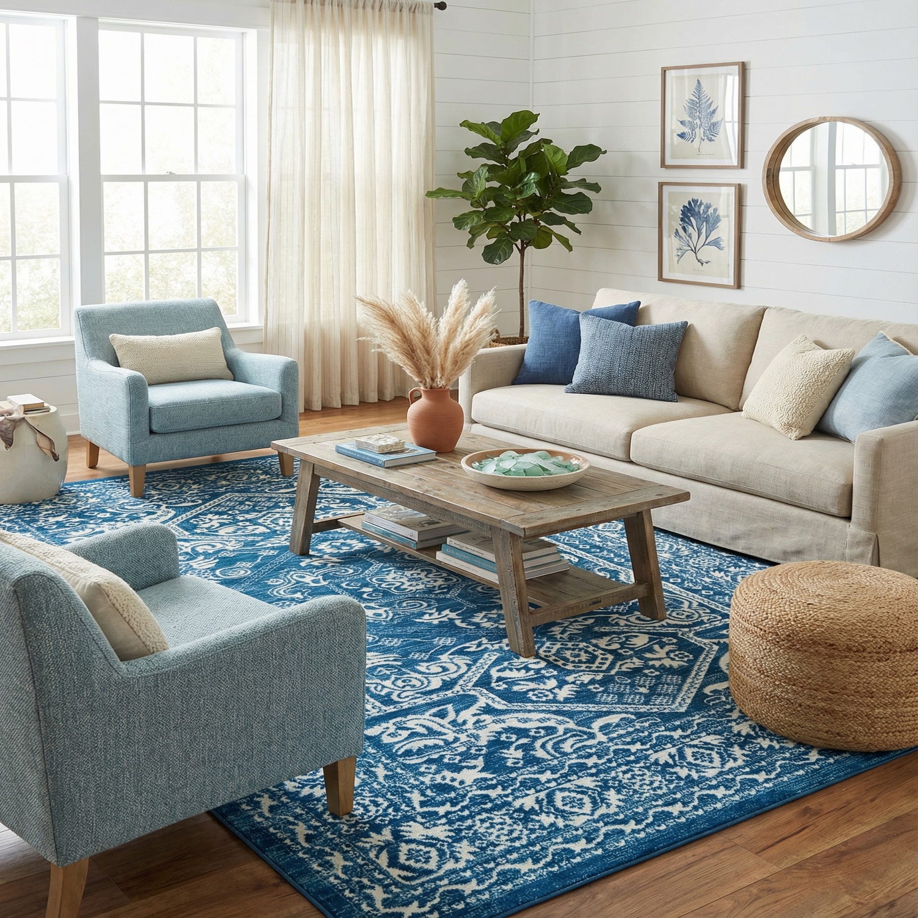 Primary color is Blue. Colors in this rug include: Blue, Ivory.