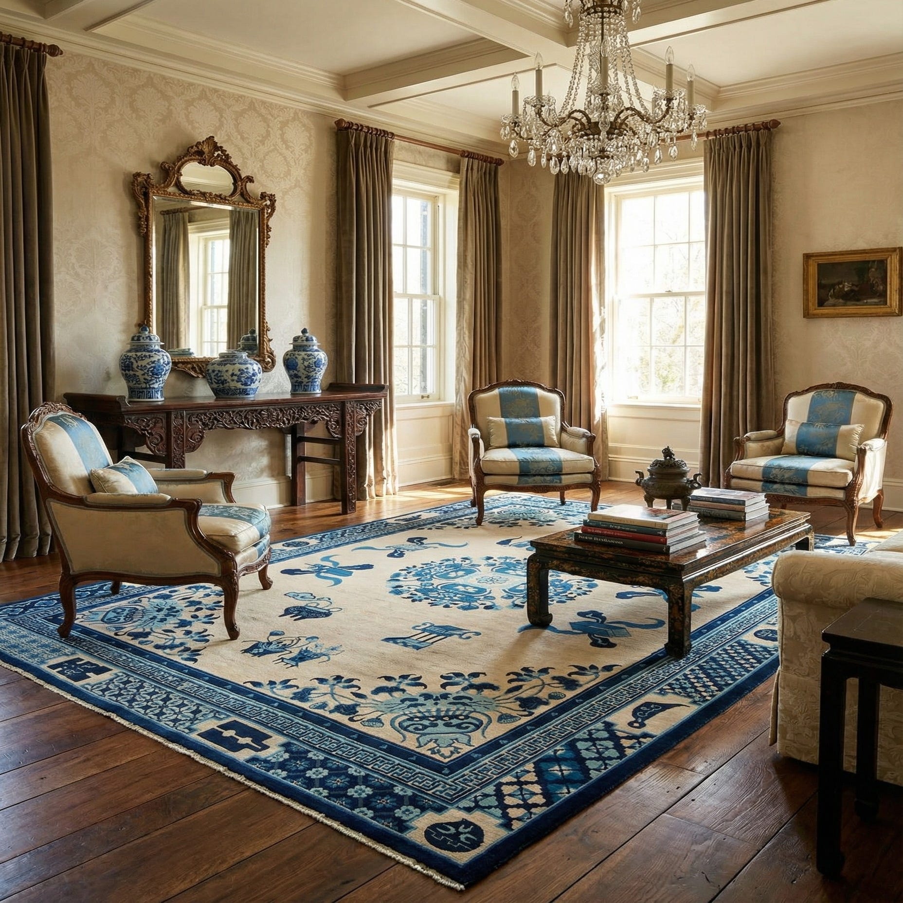 Primary color is Blue. Colors in this rug include: Blue, Beige, Dark Blue.