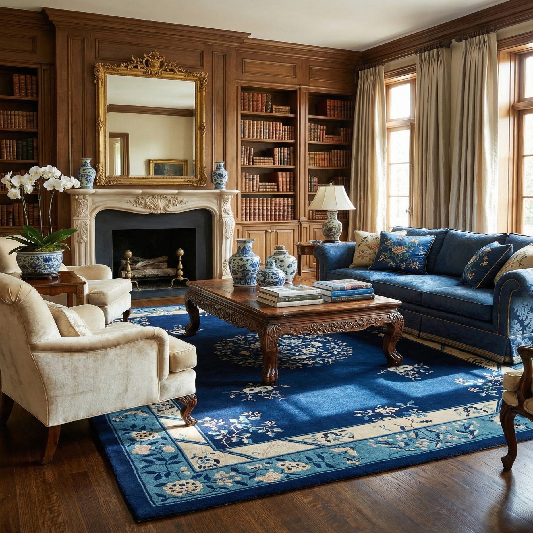 Primary color is Blue. Colors in this rug include: Blue, Beige, Dark Blue.