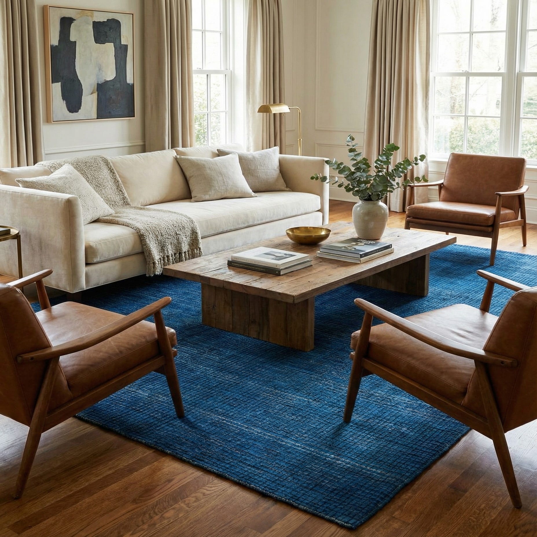 Primary color is Blue. Colors in this rug include: Blue, Black, Ivory.
