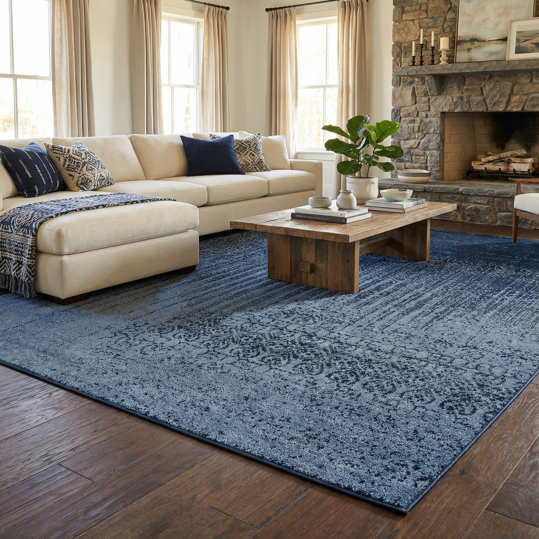 Primary color is Blue. Colors in this rug include: Blue, Navy Blue.