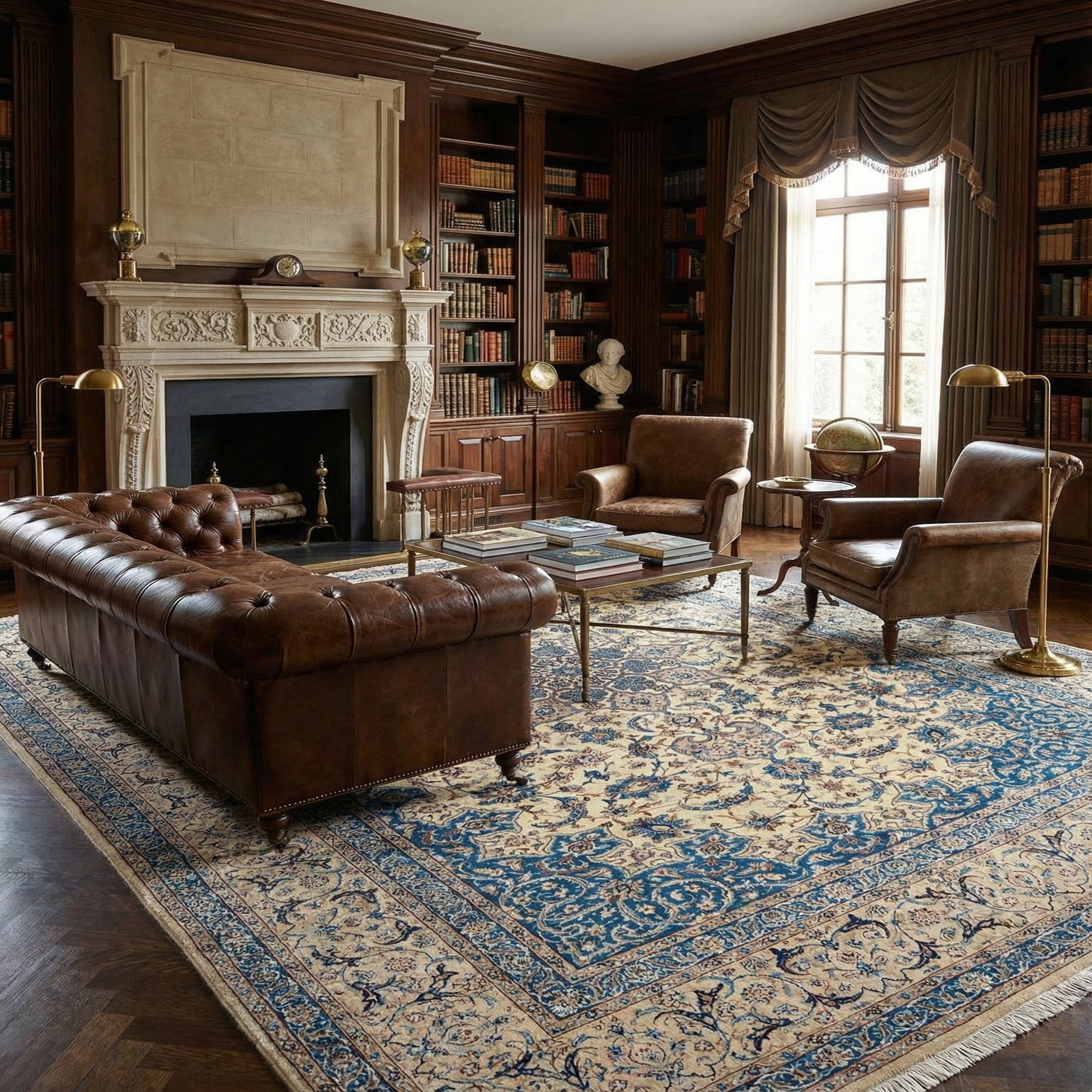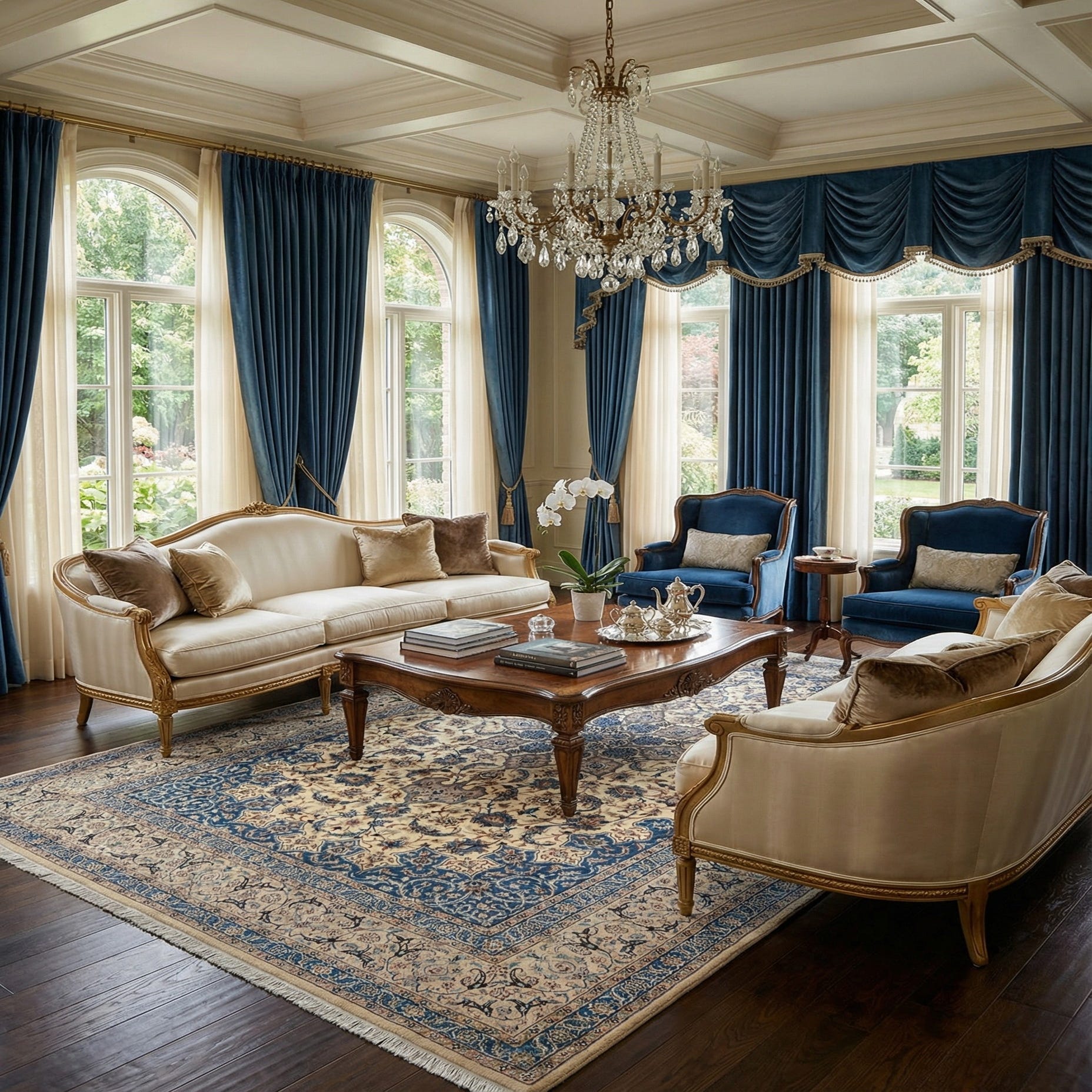 Primary color is Blue. Colors in this rug include: Blue, Beige.