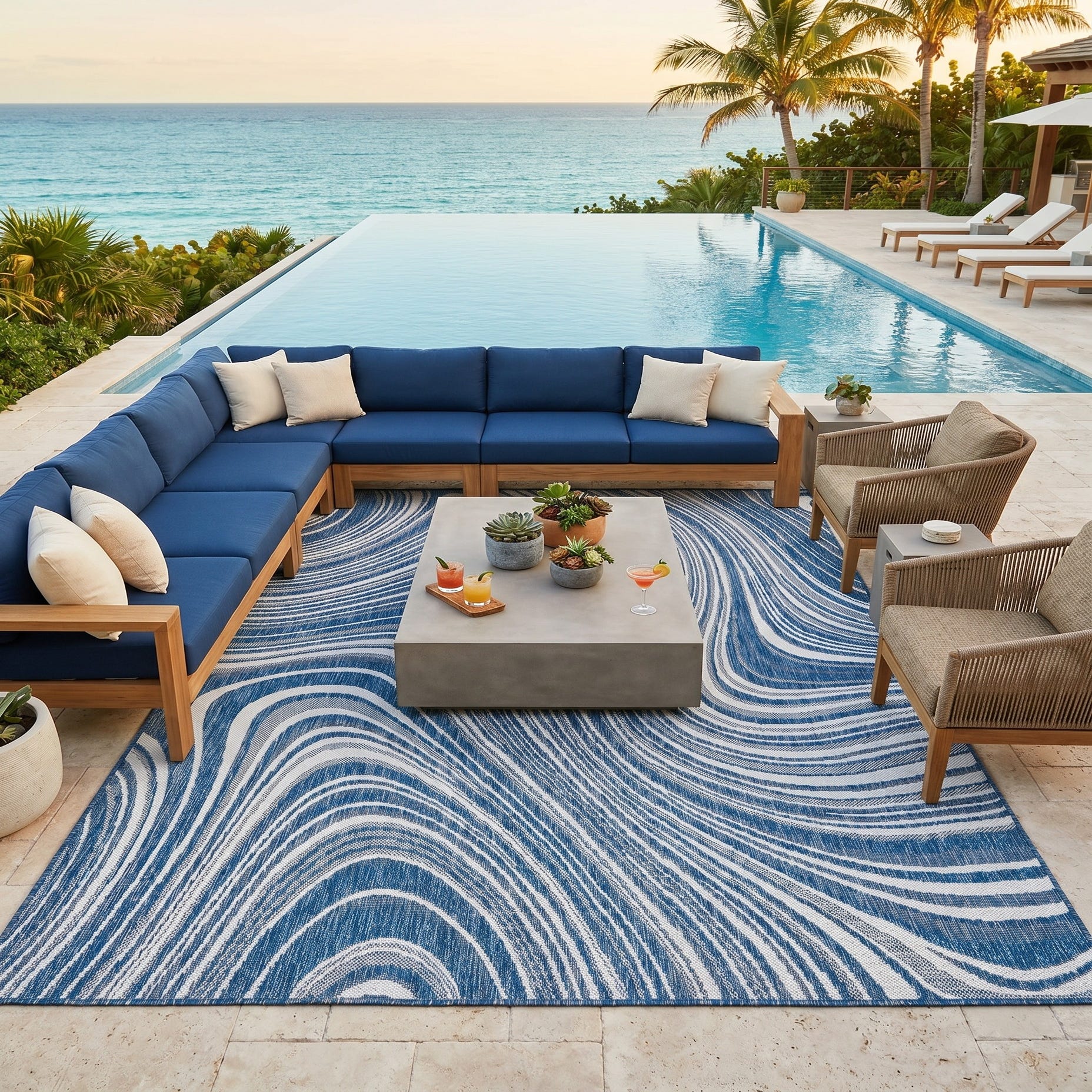 Love the contemporary look of this rug! We are so happy we chose this to accent the blue of our pool with our living area on our lanai. We still are going to add a few more pillows but love the rug to add color.