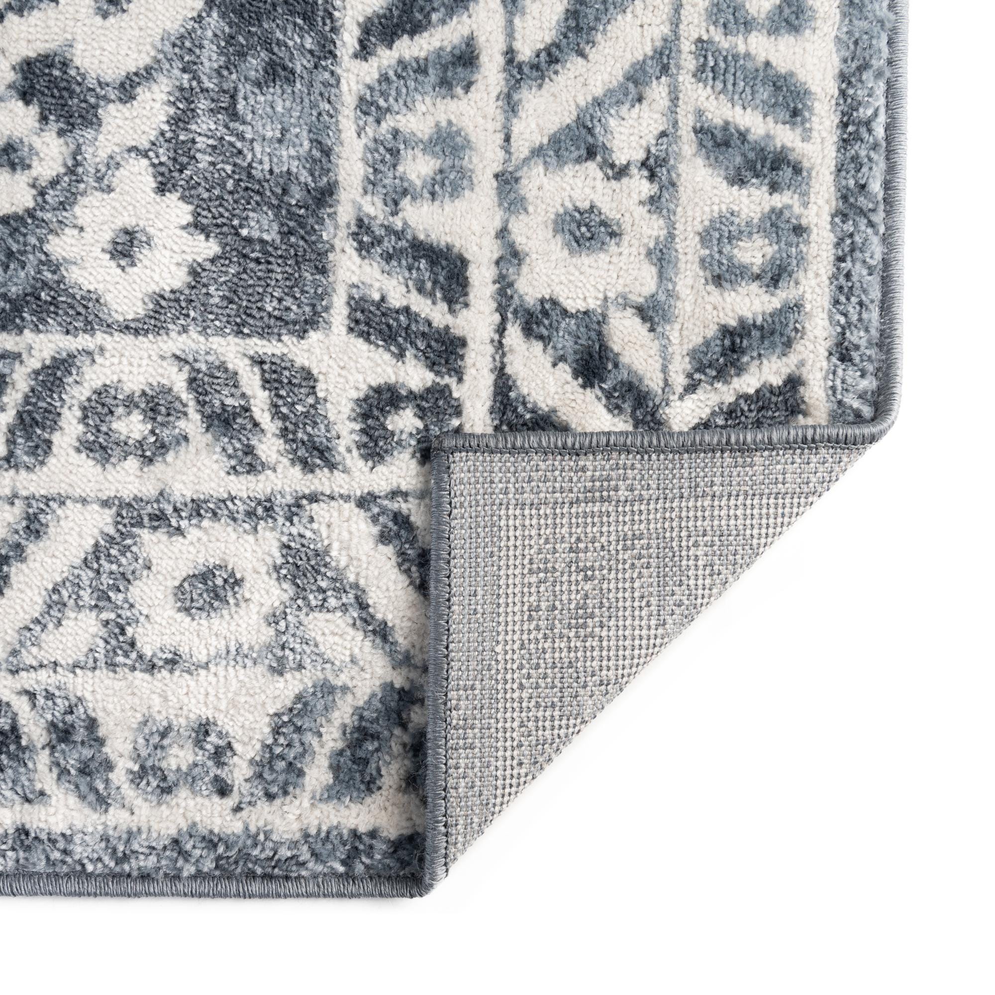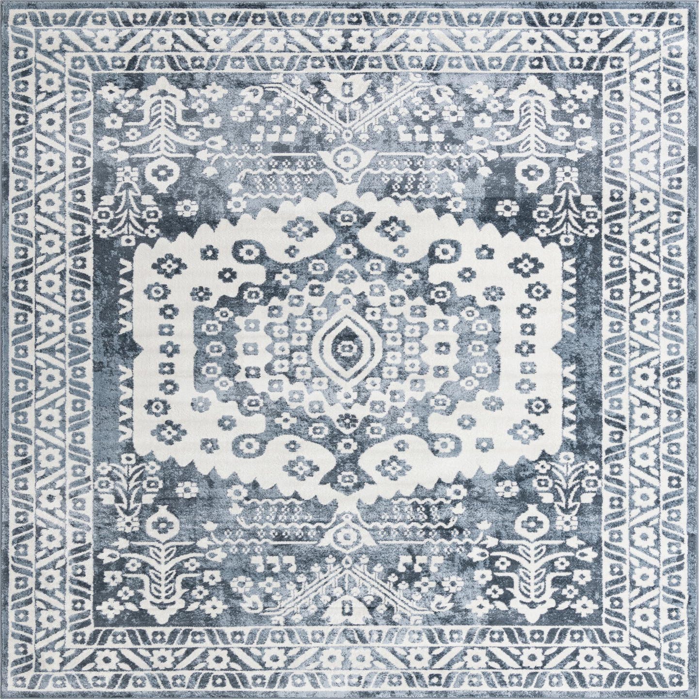 Primary color is Blue. Colors in this rug include: Blue, Ivory.
