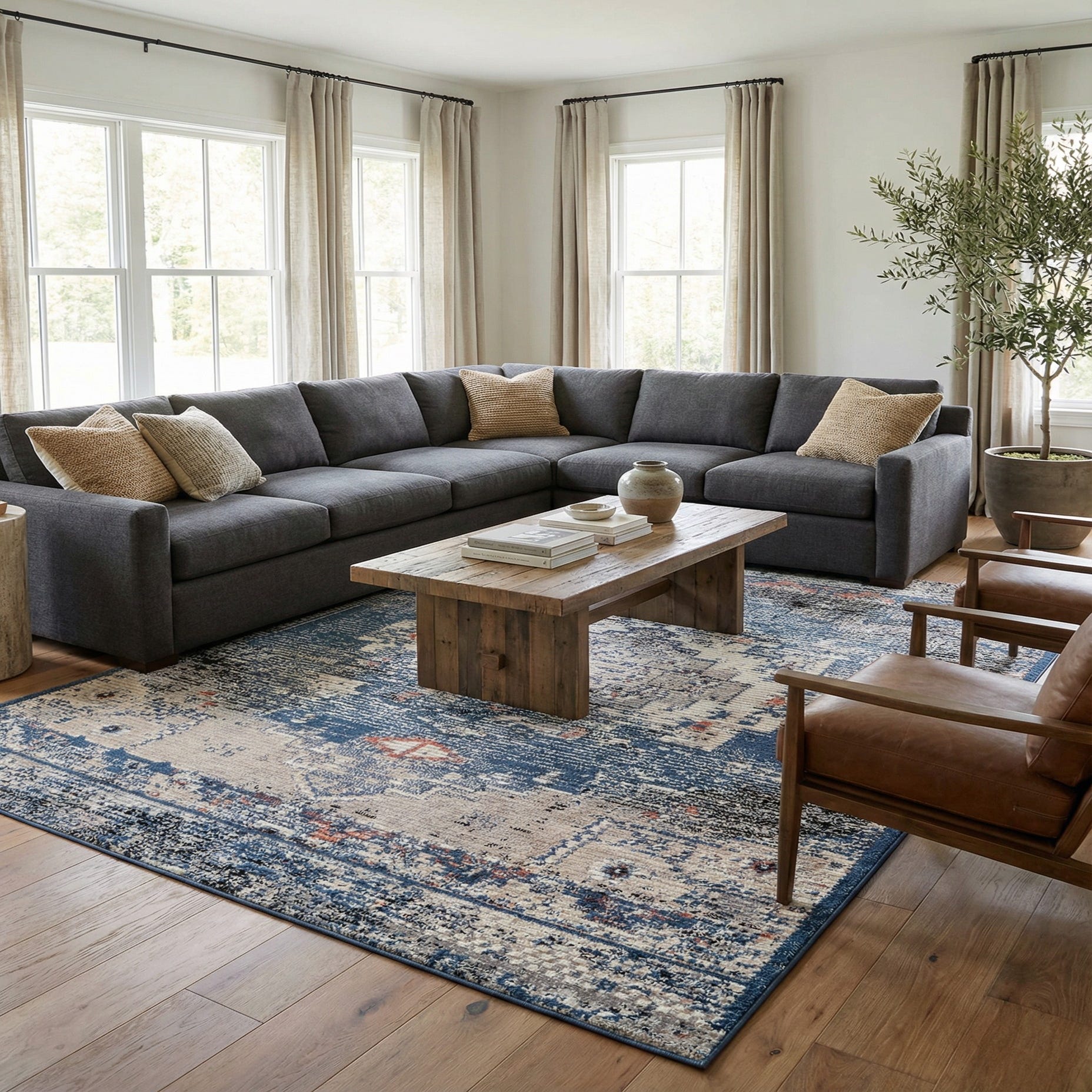 Primary color is Blue. Colors in this rug include: Blue, Beige, Black, Gray, Ivory, Rust Red.