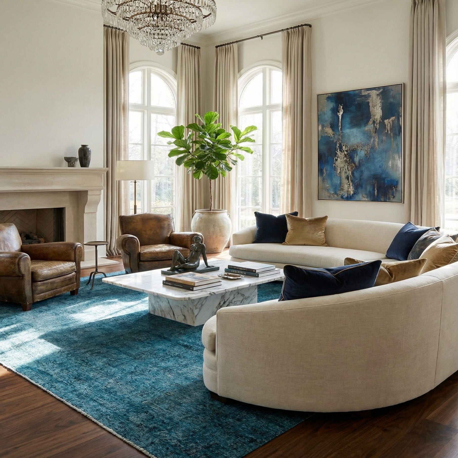 Primary color is Blue. Colors in this rug include: Blue, Black, Ivory.