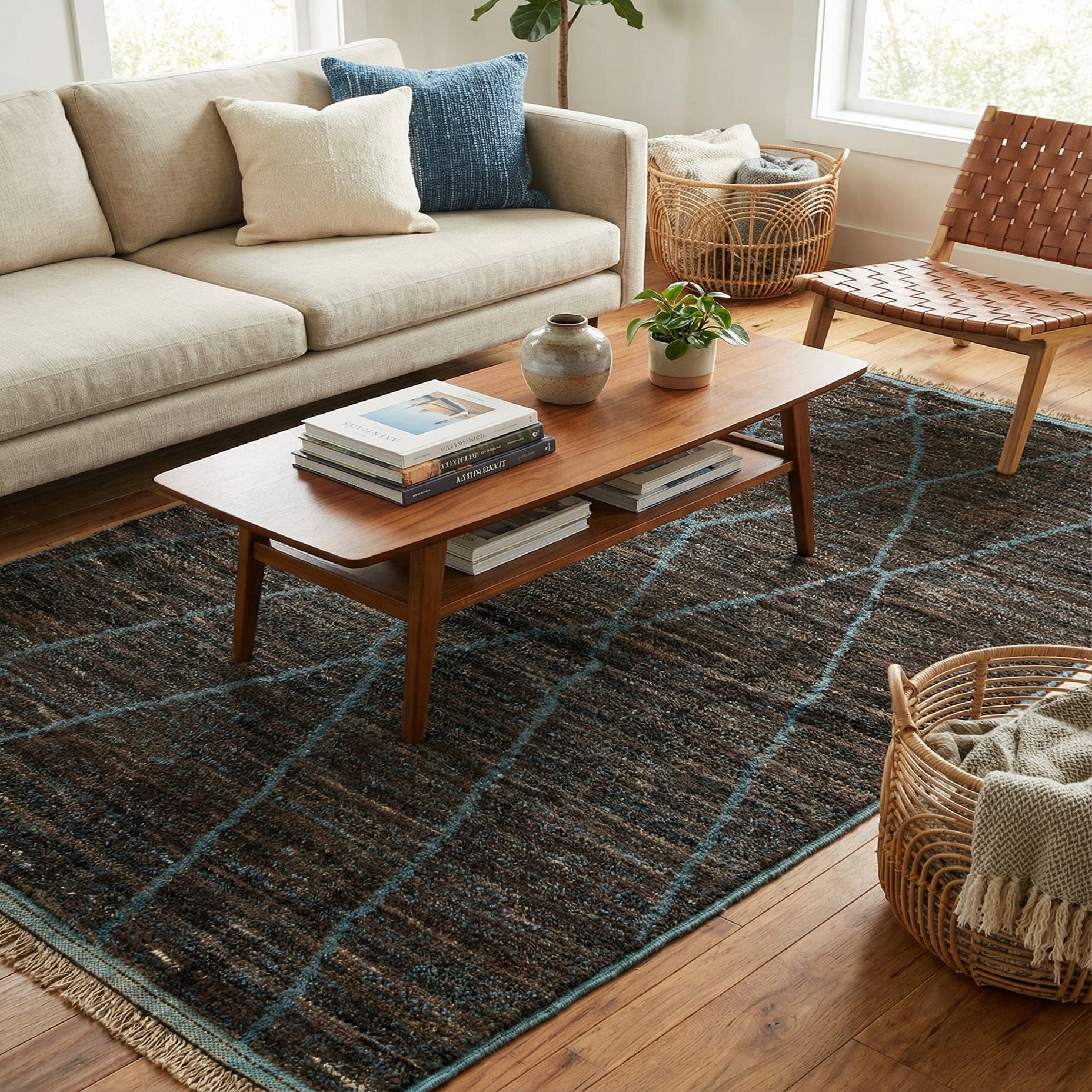 Primary color is Blue and Brown. Colors in this rug include: Blue and Brown, Beige, Light Brown, Ivory.