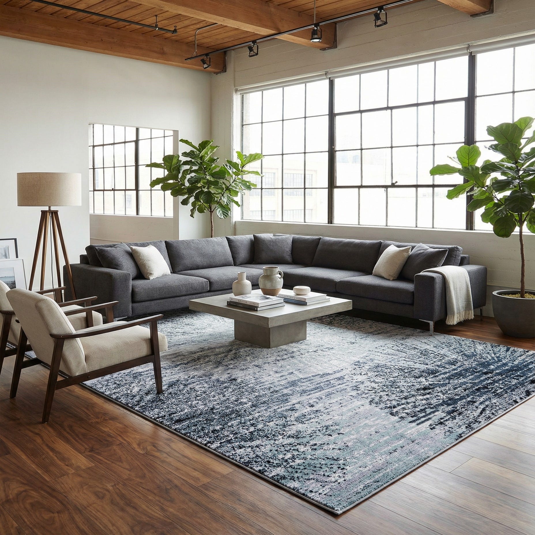 Primary color is Blue and Gray. Colors in this rug include: Blue and Gray, Ivory, Light Blue, Navy Blue.