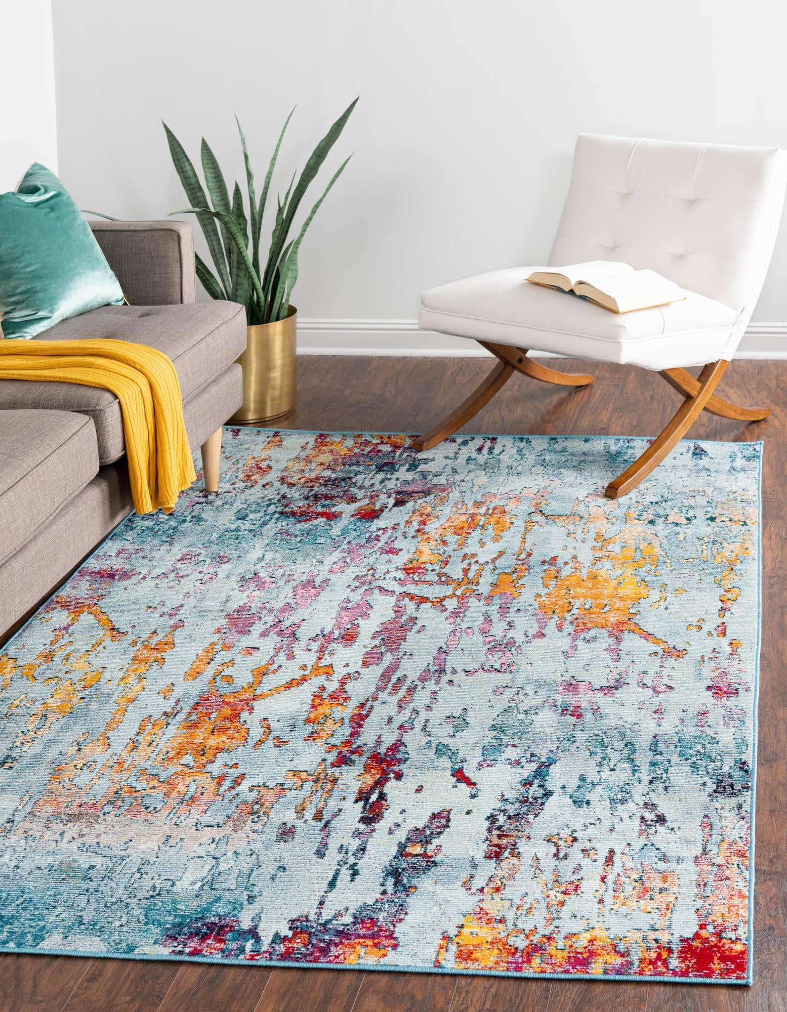 Primary color is Blue and Multi. Colors in this rug include: Blue and Multi, Black, Gray, Orange, Turquoise, Yellow, Ivory.