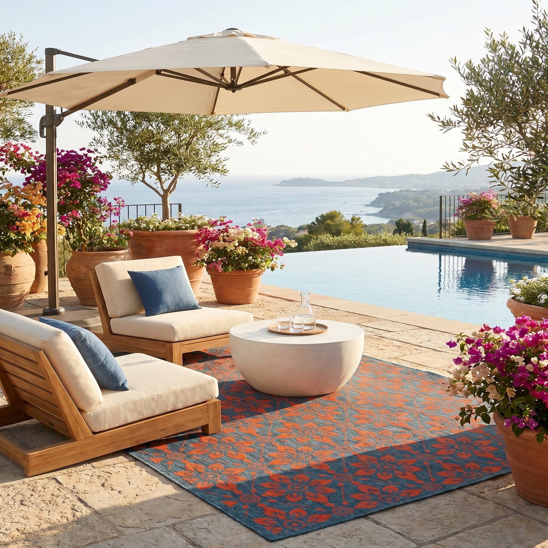 BRIGHT and SUNSHIN-Y !! Our cushions are dark green and YELLOW stripes; our table's Umbrella is bright YELLOW; and this RUG ENHANCE THEM ALL!As expected; it is taking several days for the folds to relent....the rug has after all been rolled tightly for many weeks. In MAINE where we live SPRING AND SUMMER are hugely beloved after long and cold and snowy and icy winters! This is SUNSHINE on the floor!