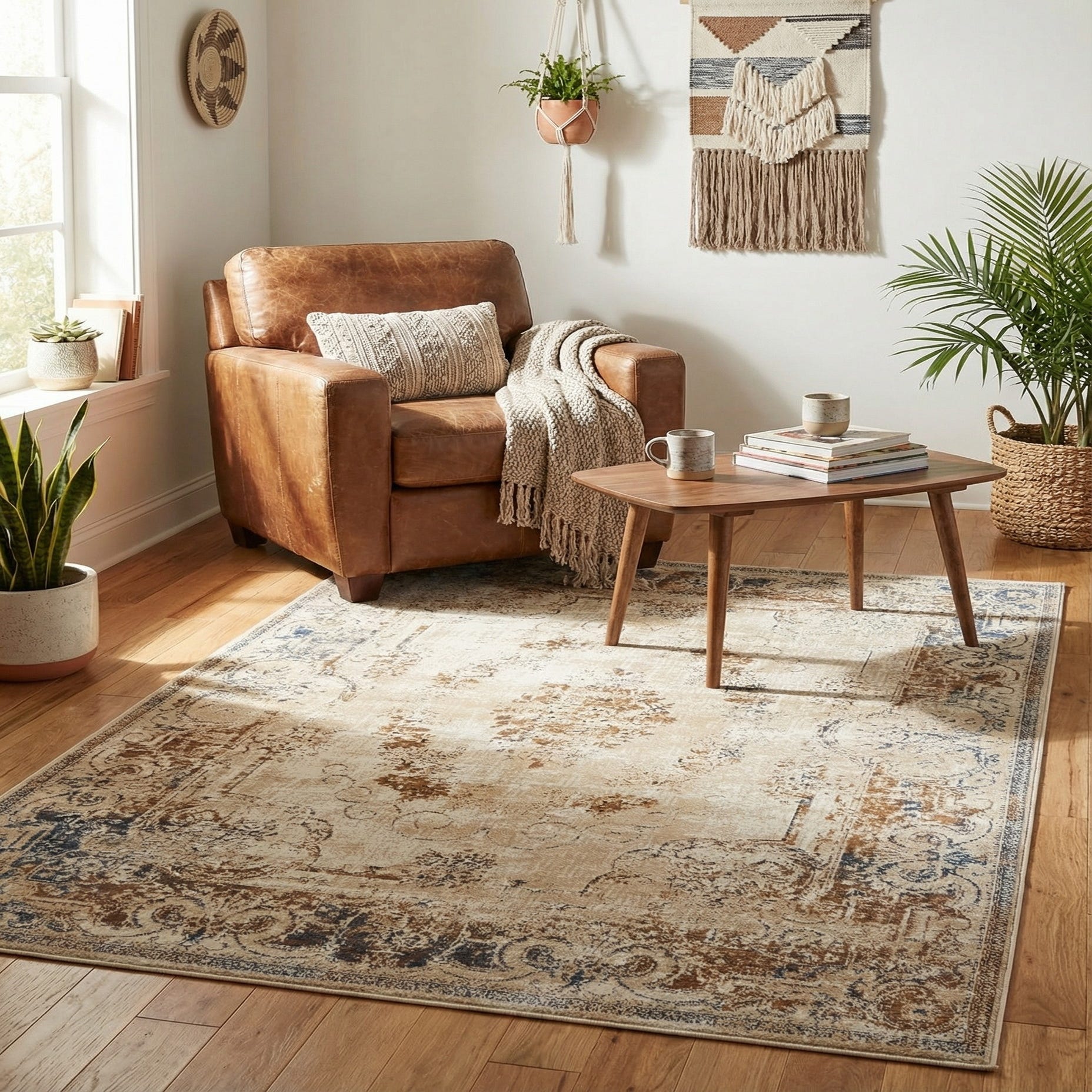 Primary color is Blue Cream. Colors in this rug include: Blue Cream, Beige, Brown, Gray.
