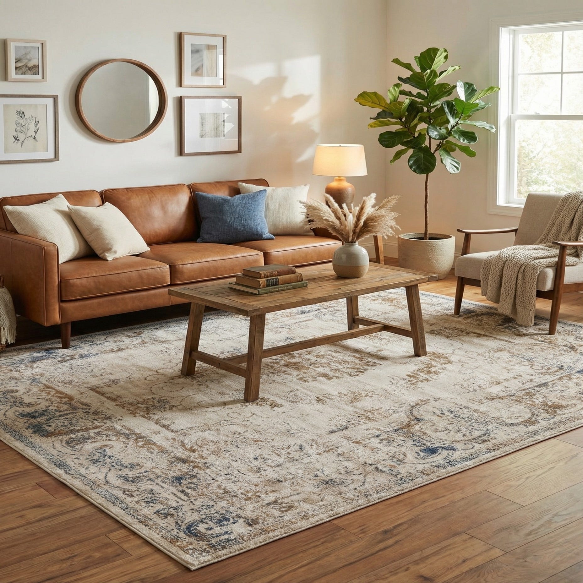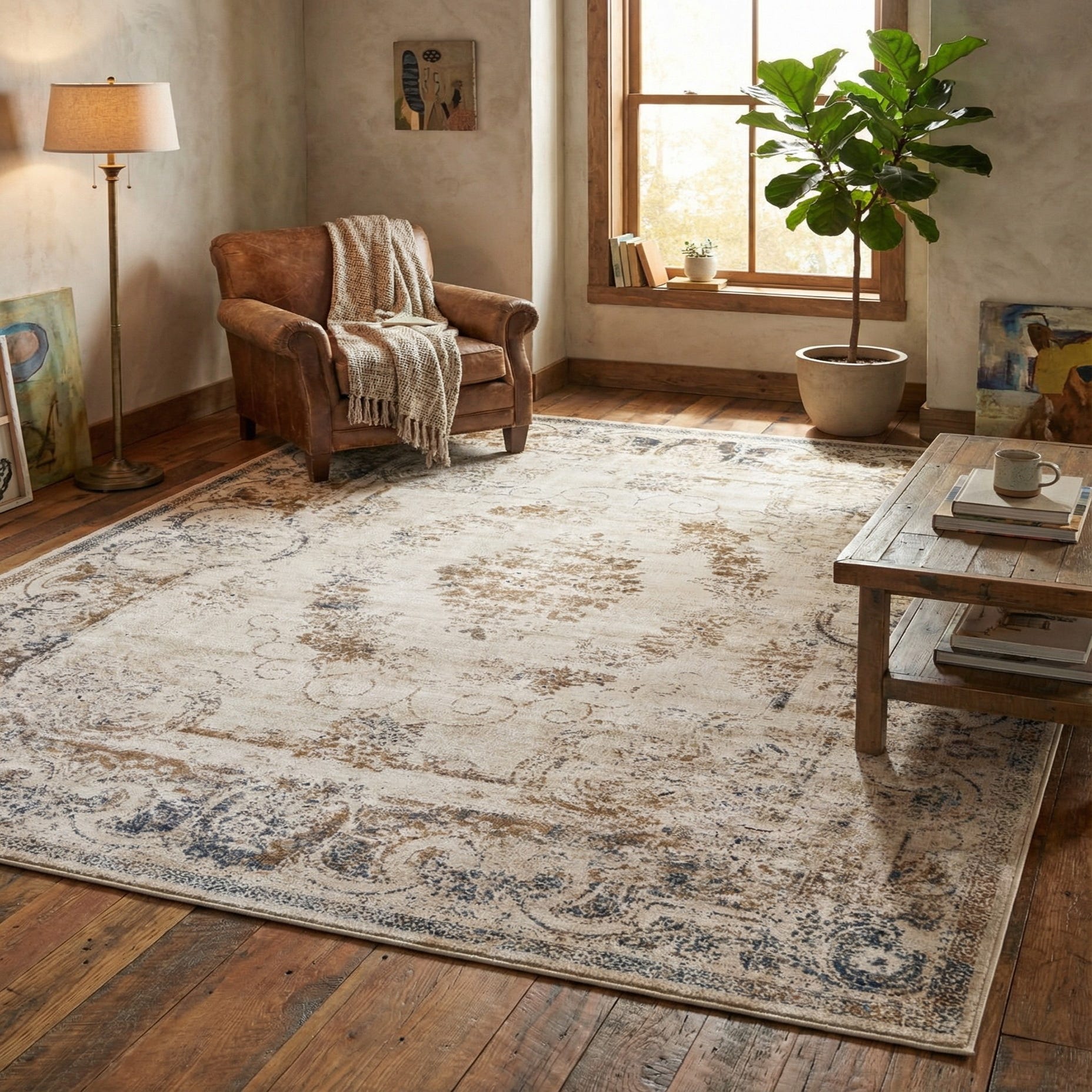 Primary color is Blue Cream. Colors in this rug include: Blue Cream, Beige, Blue, Brown, Gray.