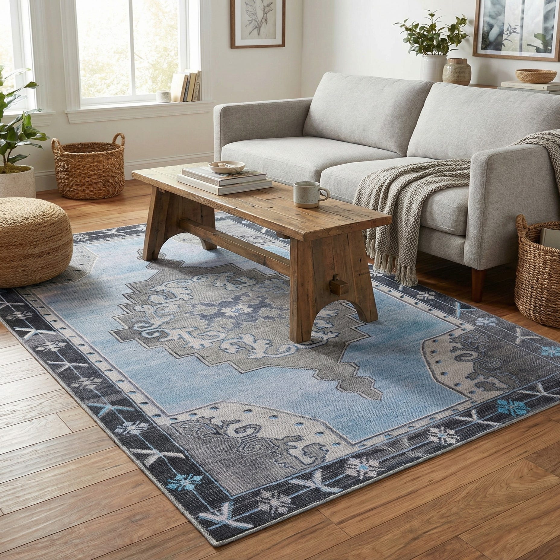 Primary color is Blue Gray. Colors in this rug include: Blue Gray, Ivory.