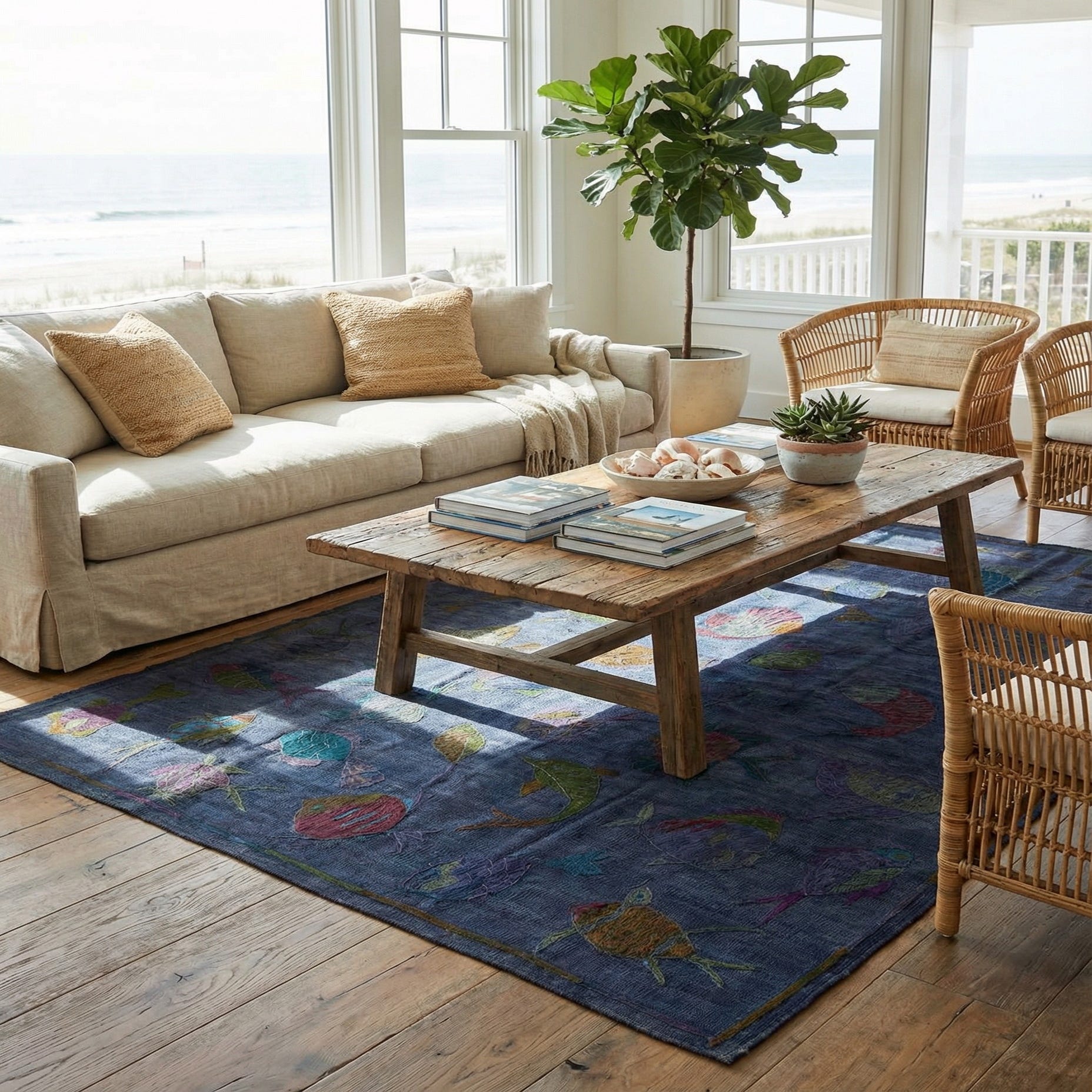 Primary color is Blue Gray. Colors in this rug include: Blue Gray, Green, Navy Blue, Purple, Pink, Yellow.