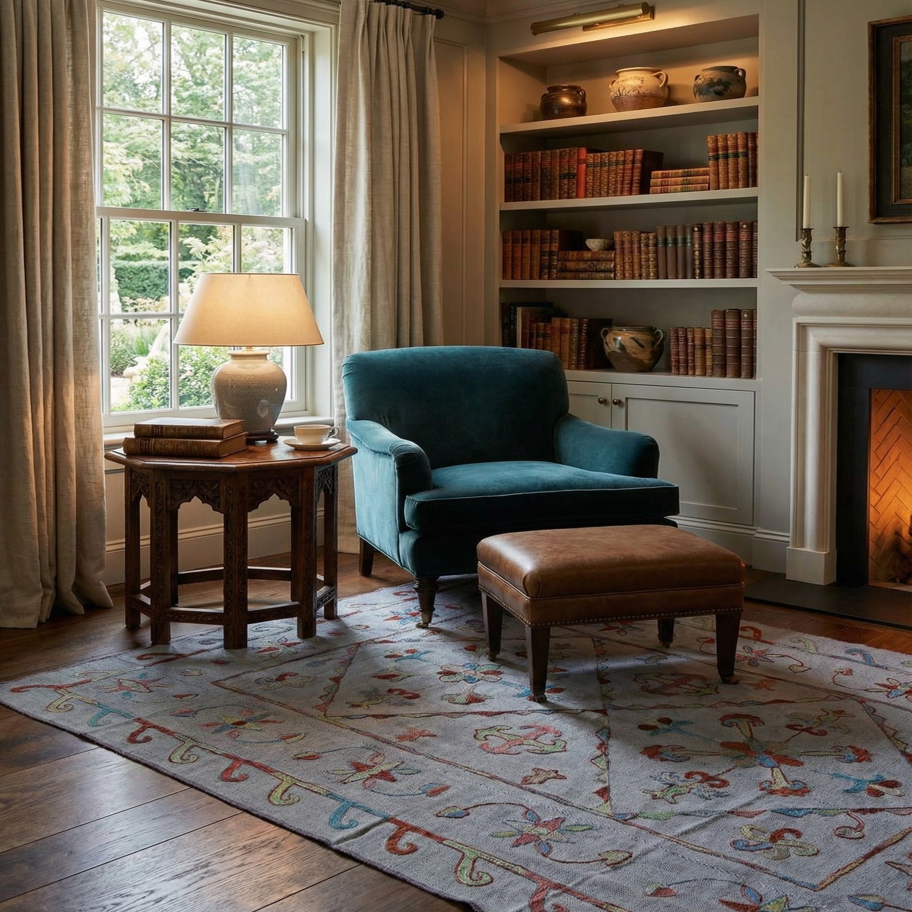 Primary color is Blue Gray. Colors in this rug include: Blue Gray, Blue, Green, Rust Red.