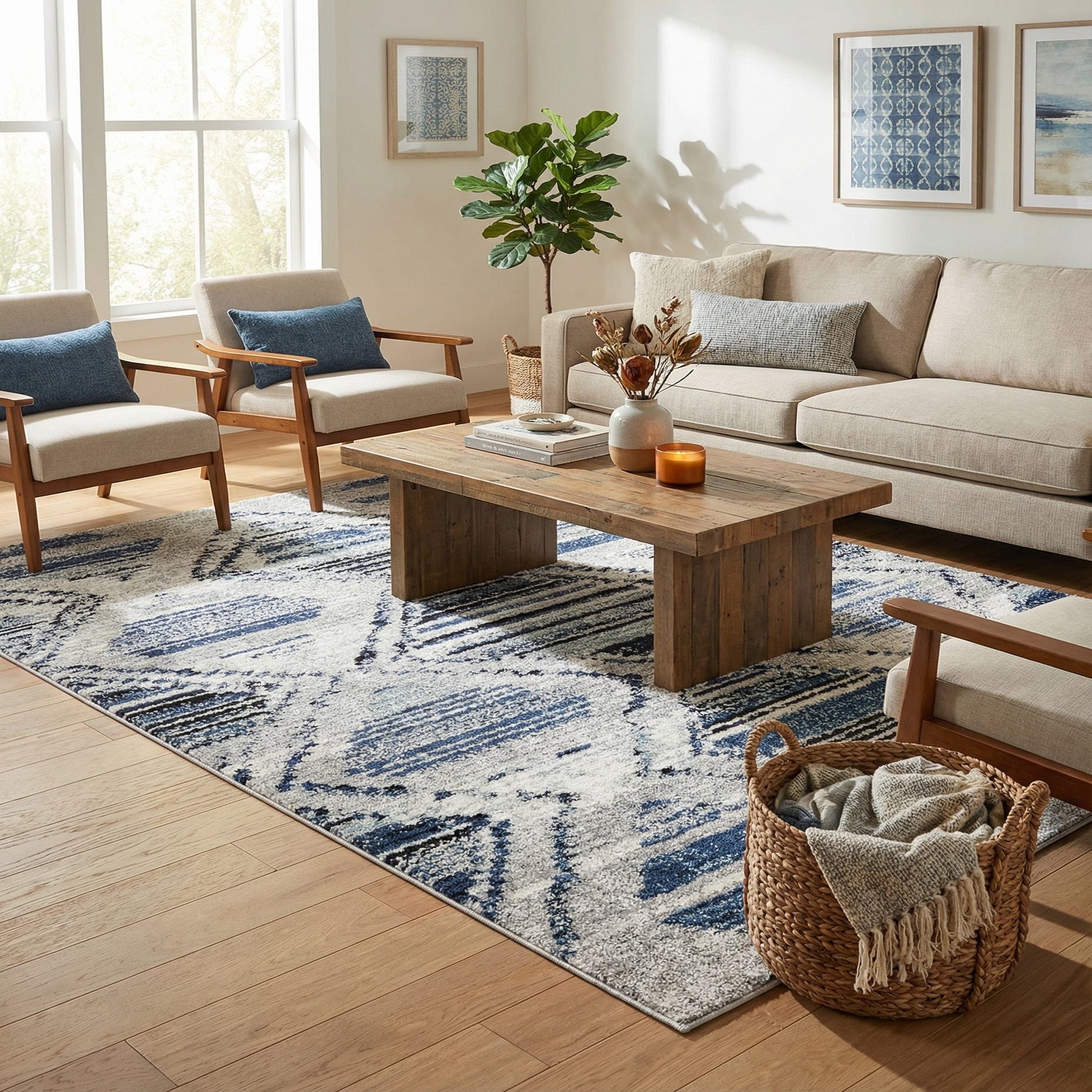 Primary color is Blue Gray. Colors in this rug include: Blue Gray, Black, Light Blue, Ivory.