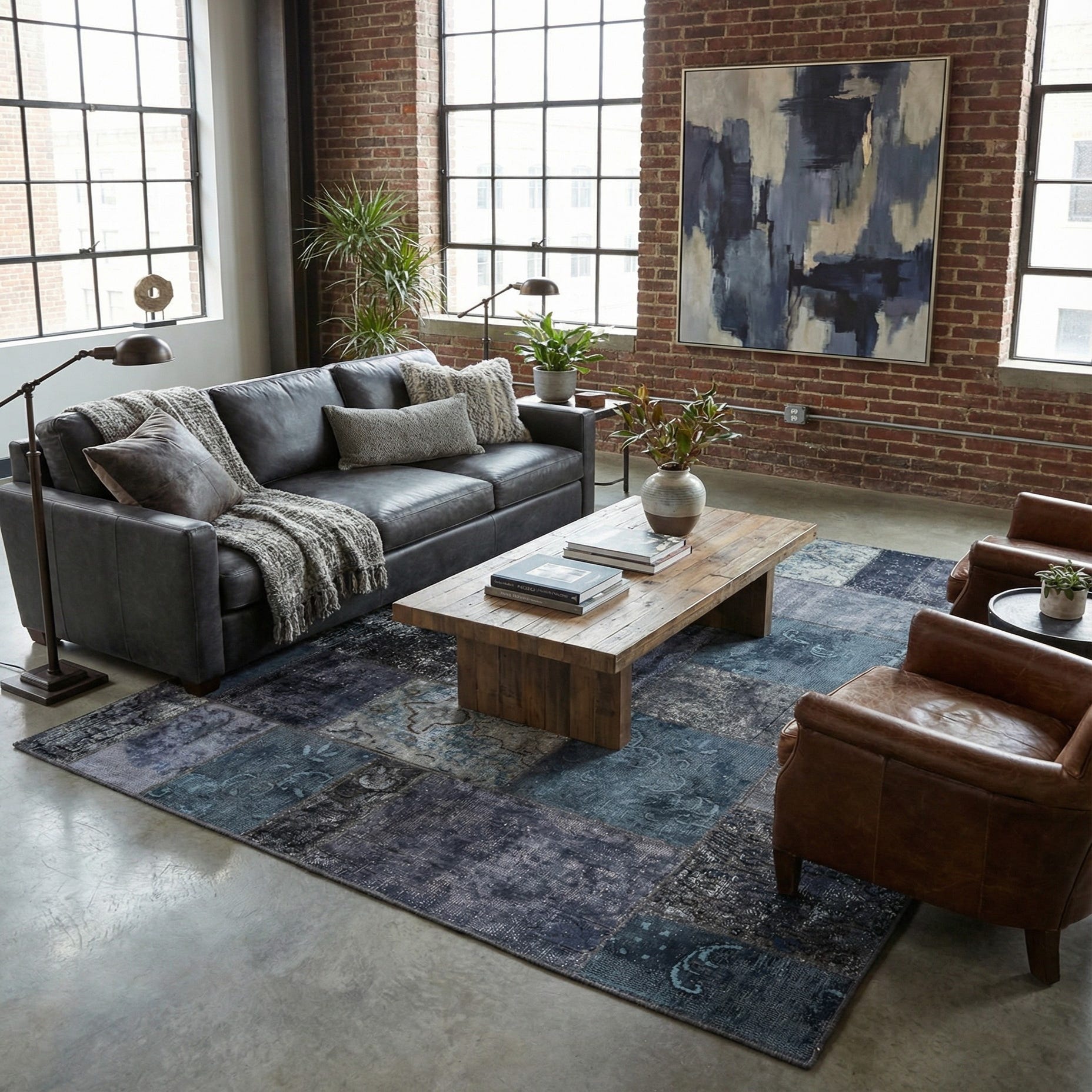 Primary color is Blue Gray. Colors in this rug include: Blue Gray, Black, Brown, Purple, Ivory.