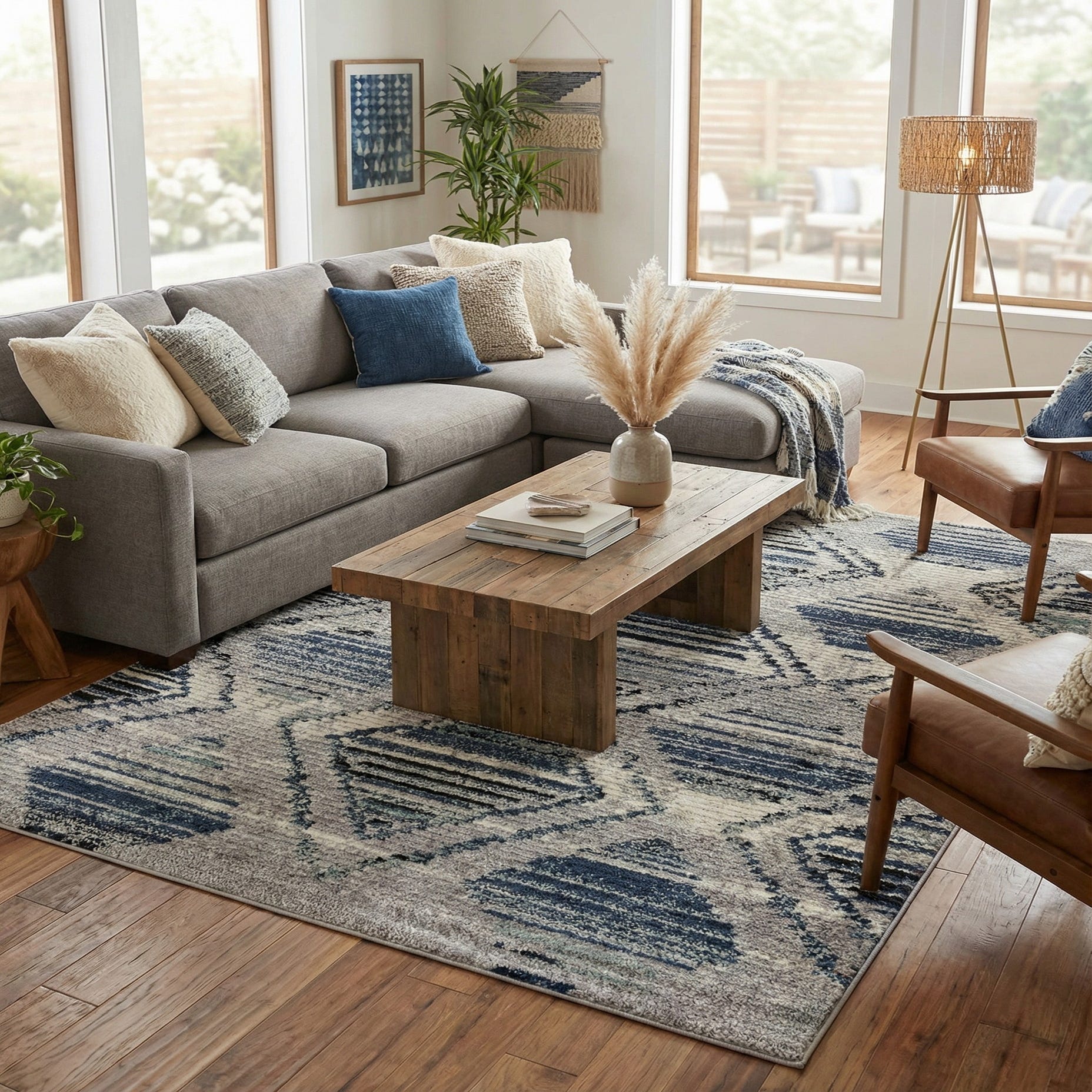 Primary color is Blue Gray. Colors in this rug include: Blue Gray, Black, Ivory, Light Blue.