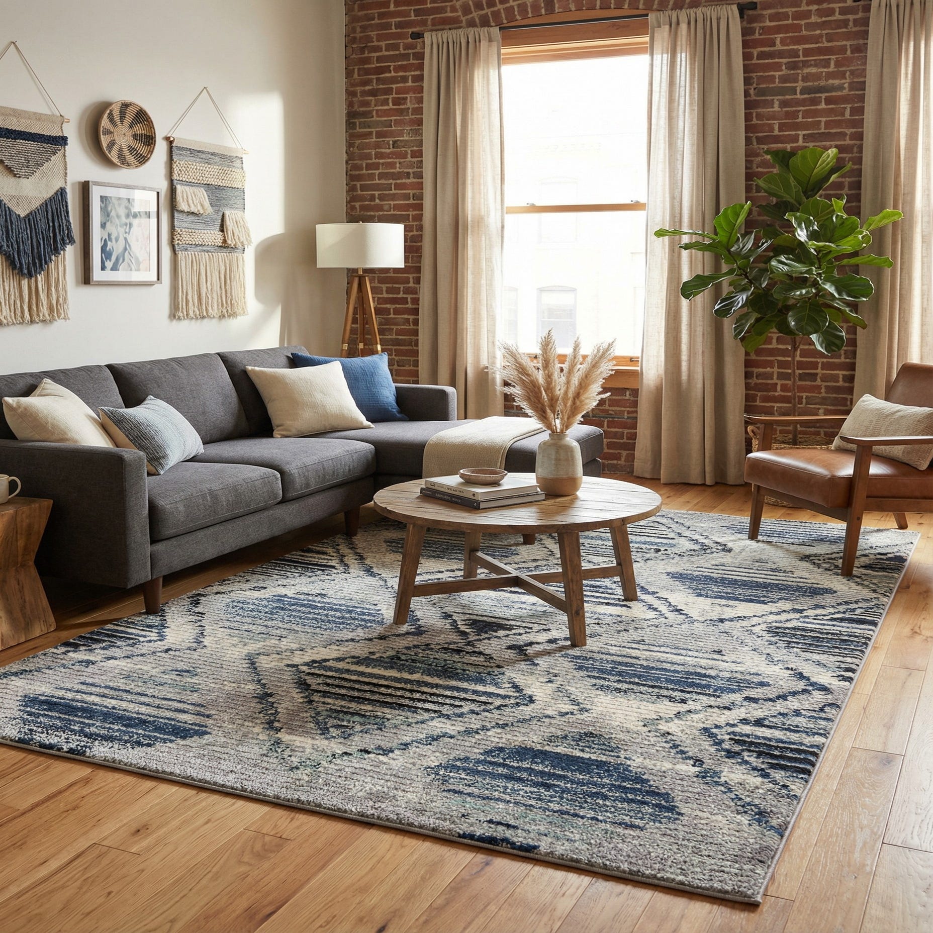 Primary color is Blue Gray. Colors in this rug include: Blue Gray, Black, Ivory, Light Blue.