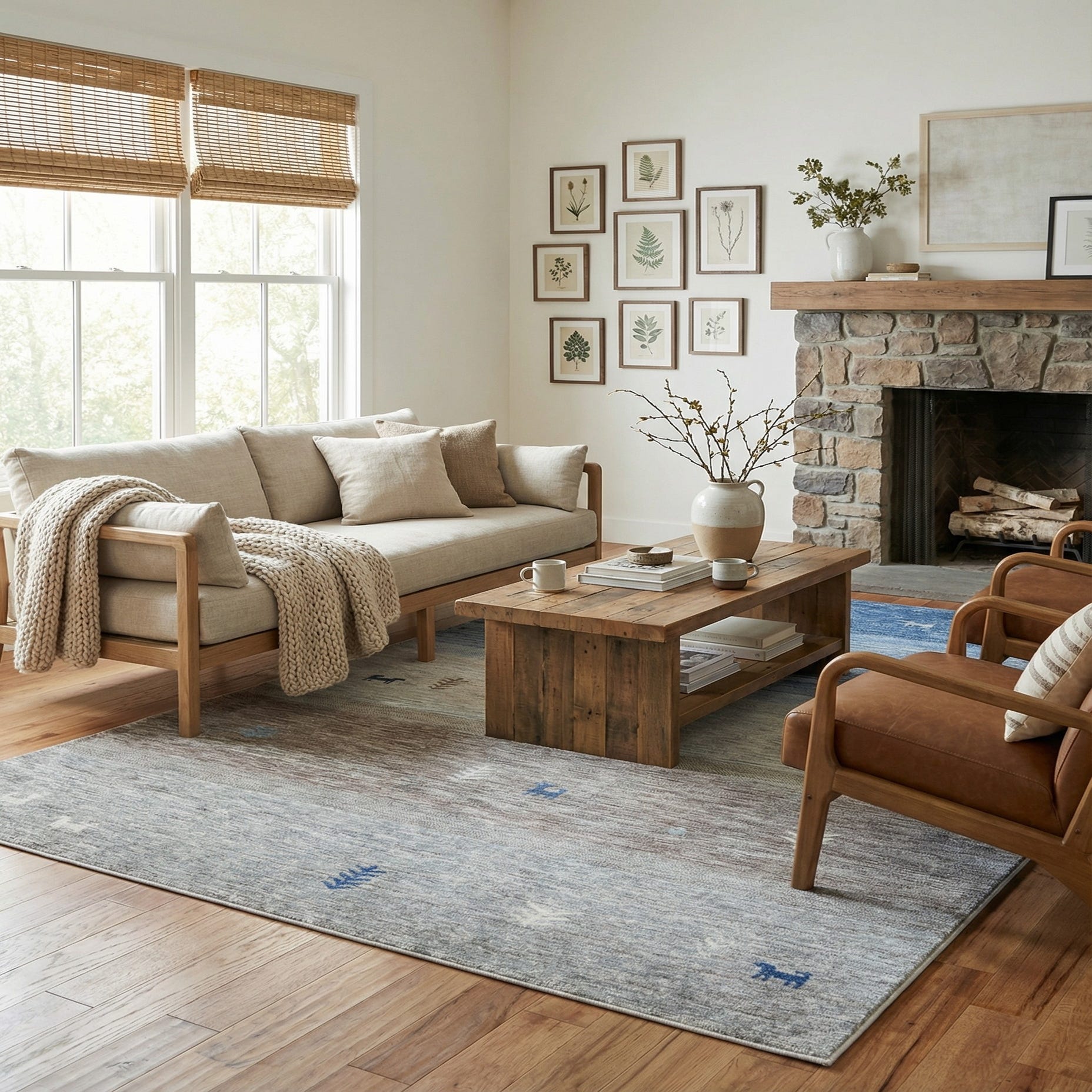 Primary color is Blue Gray. Colors in this rug include: Blue Gray, Ivory, Light Blue, Light Brown, Navy Blue.