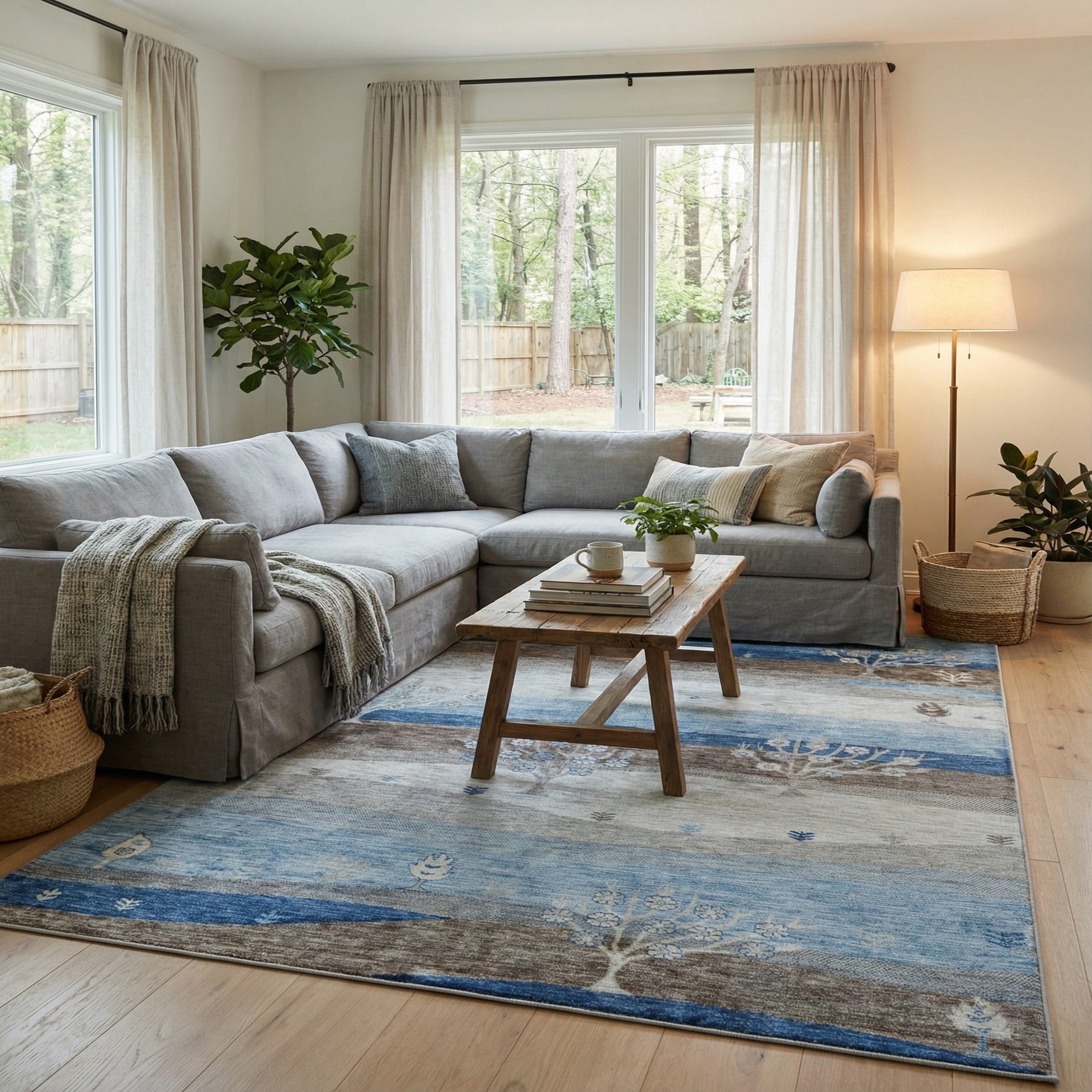 Primary color is Blue Gray. Colors in this rug include: Blue Gray, Ivory, Light Blue, Navy Blue.