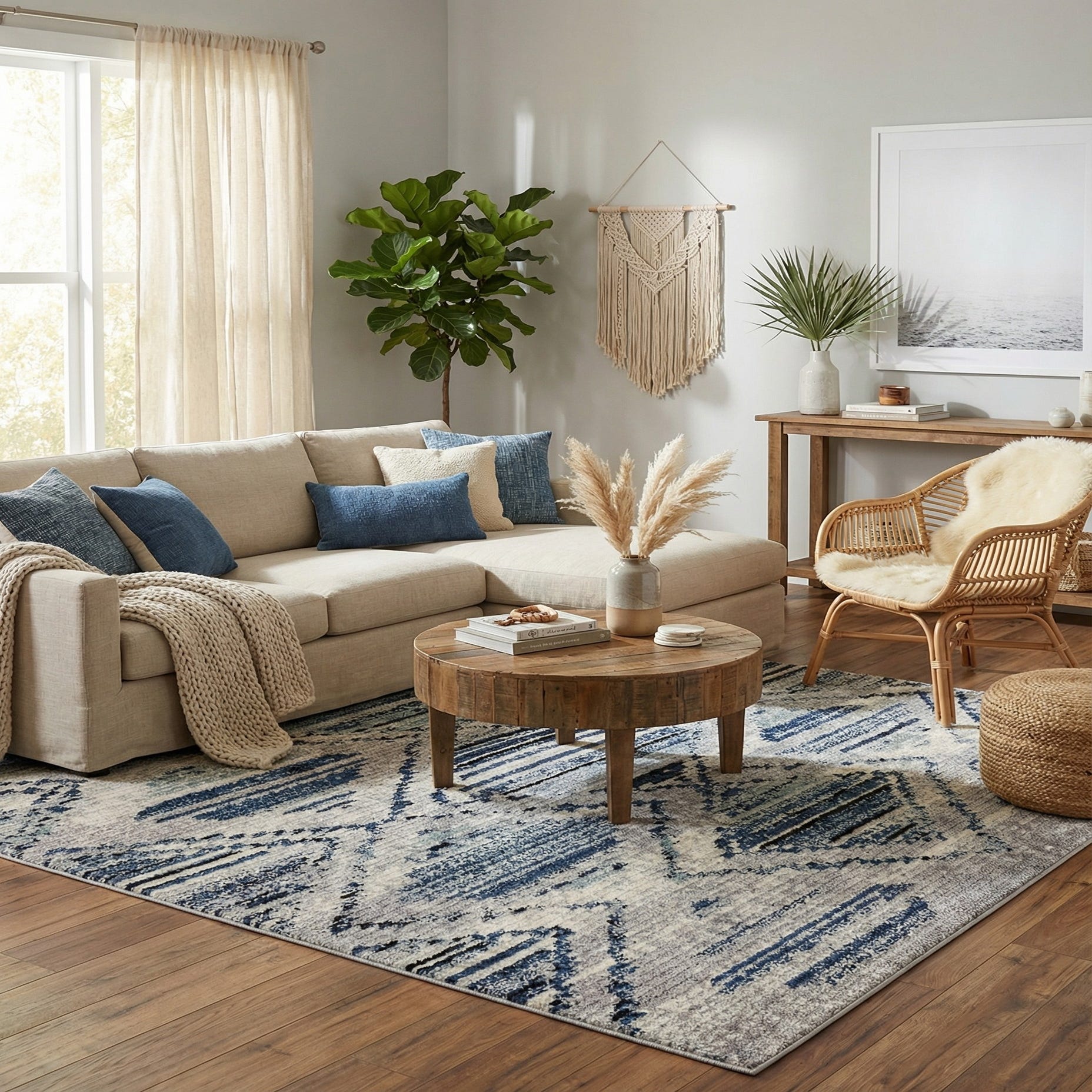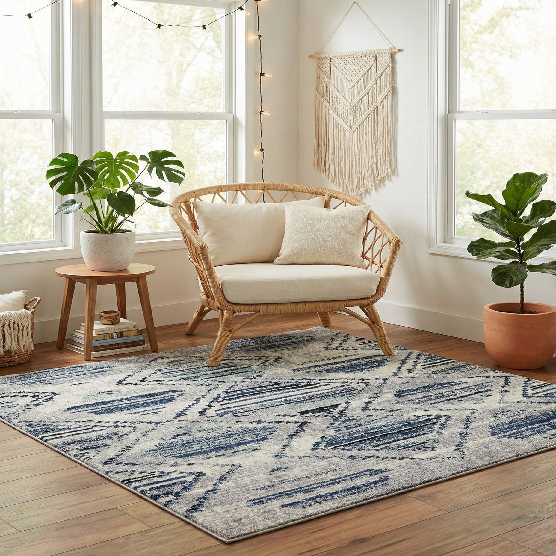 Primary color is Blue Gray. Colors in this rug include: Blue Gray, Black, Ivory, Light Blue.
