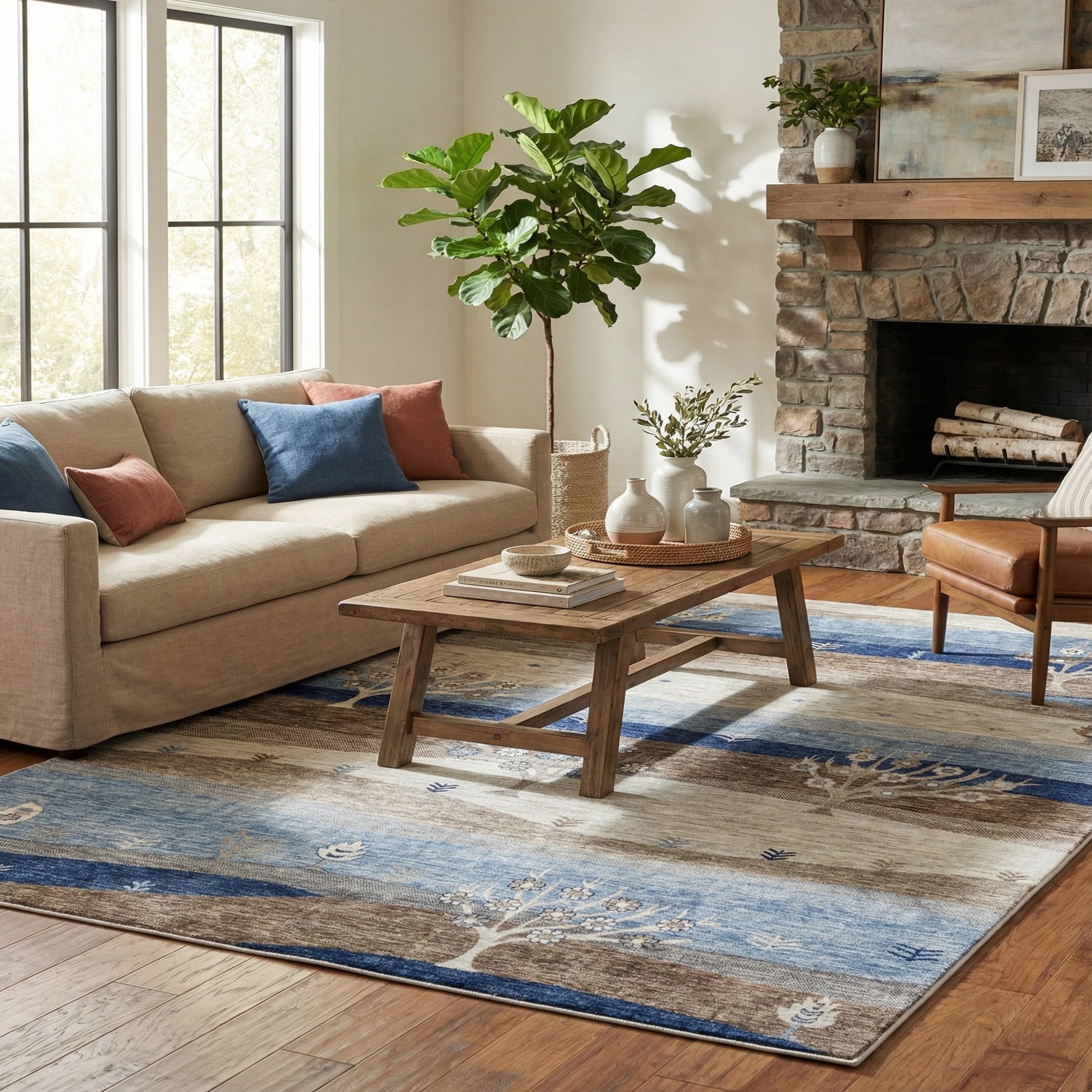 Primary color is Blue Gray. Colors in this rug include: Blue Gray, Ivory, Light Blue, Navy Blue.