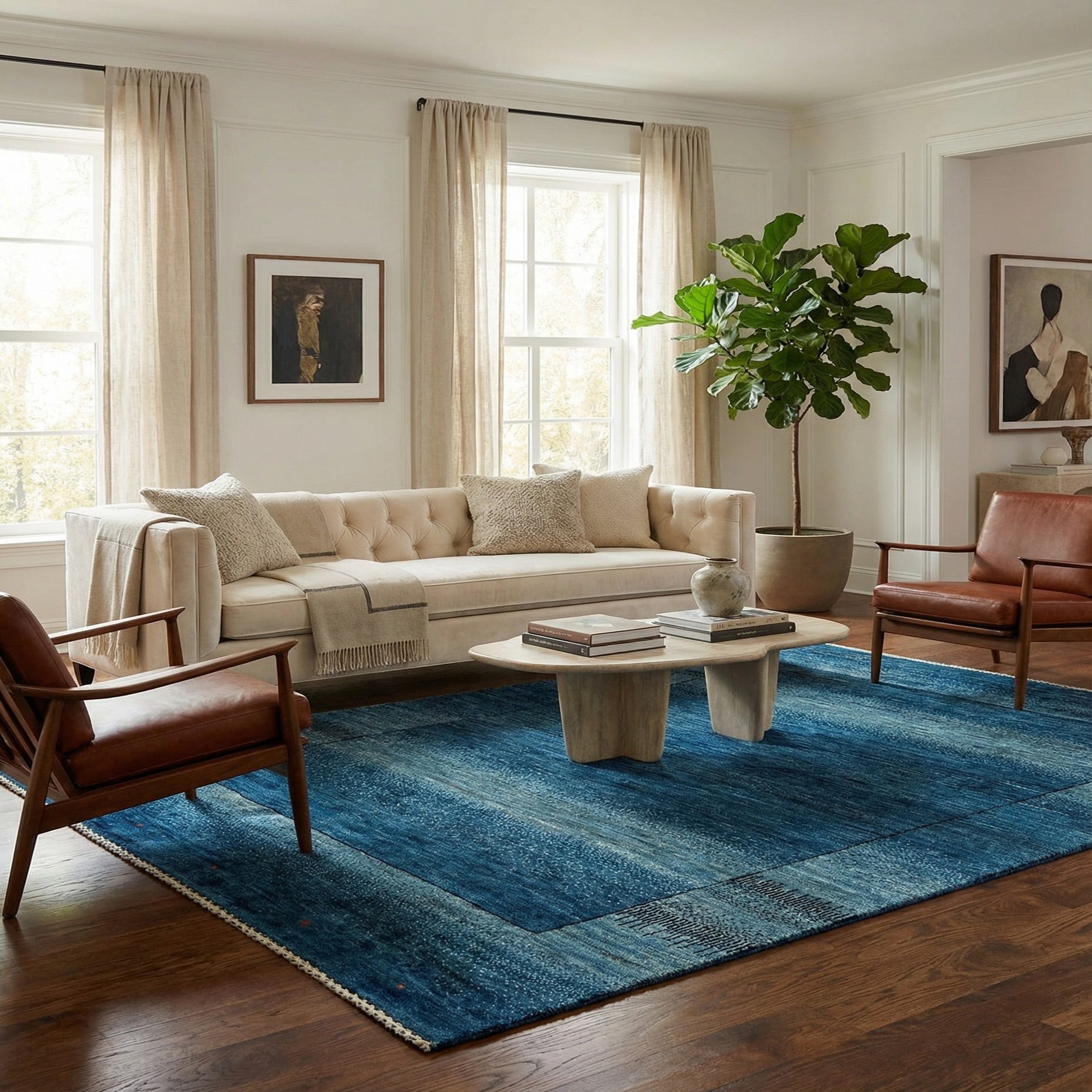 Primary color is Blue. Colors in this rug include: Blue, Rectangle.