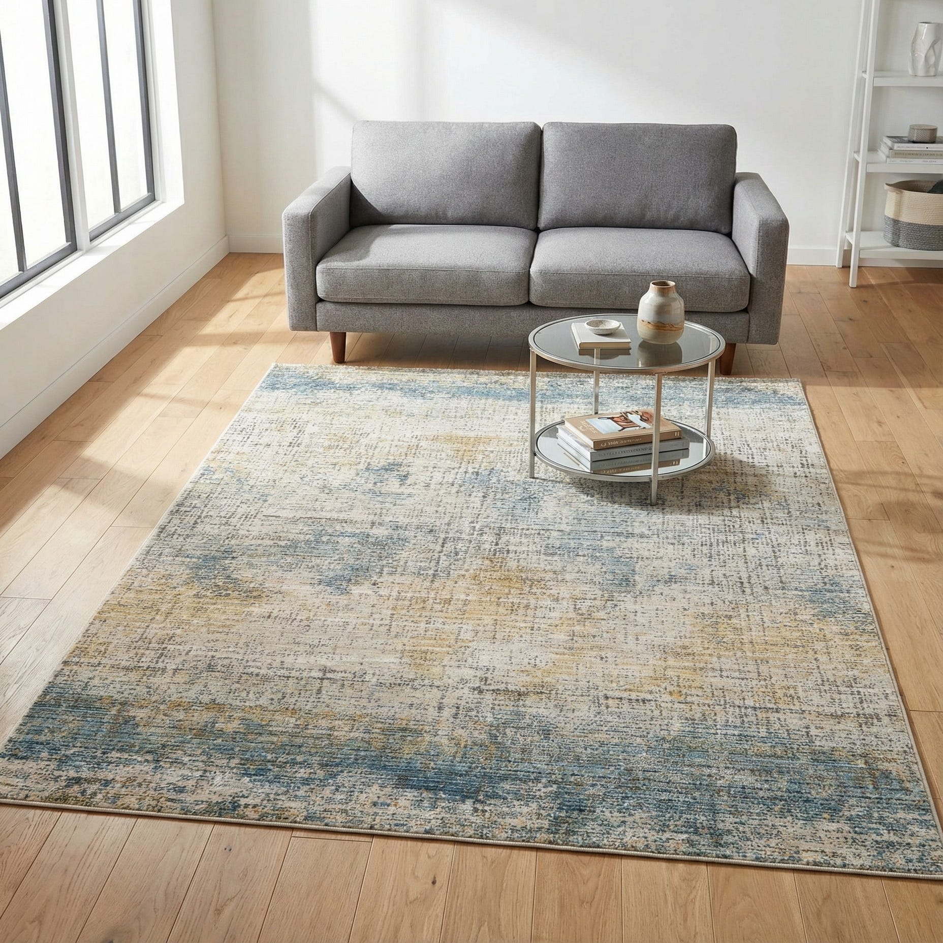 Primary color is Blue Ivory. Colors in this rug include: Blue Ivory, Gray, Yellow.
