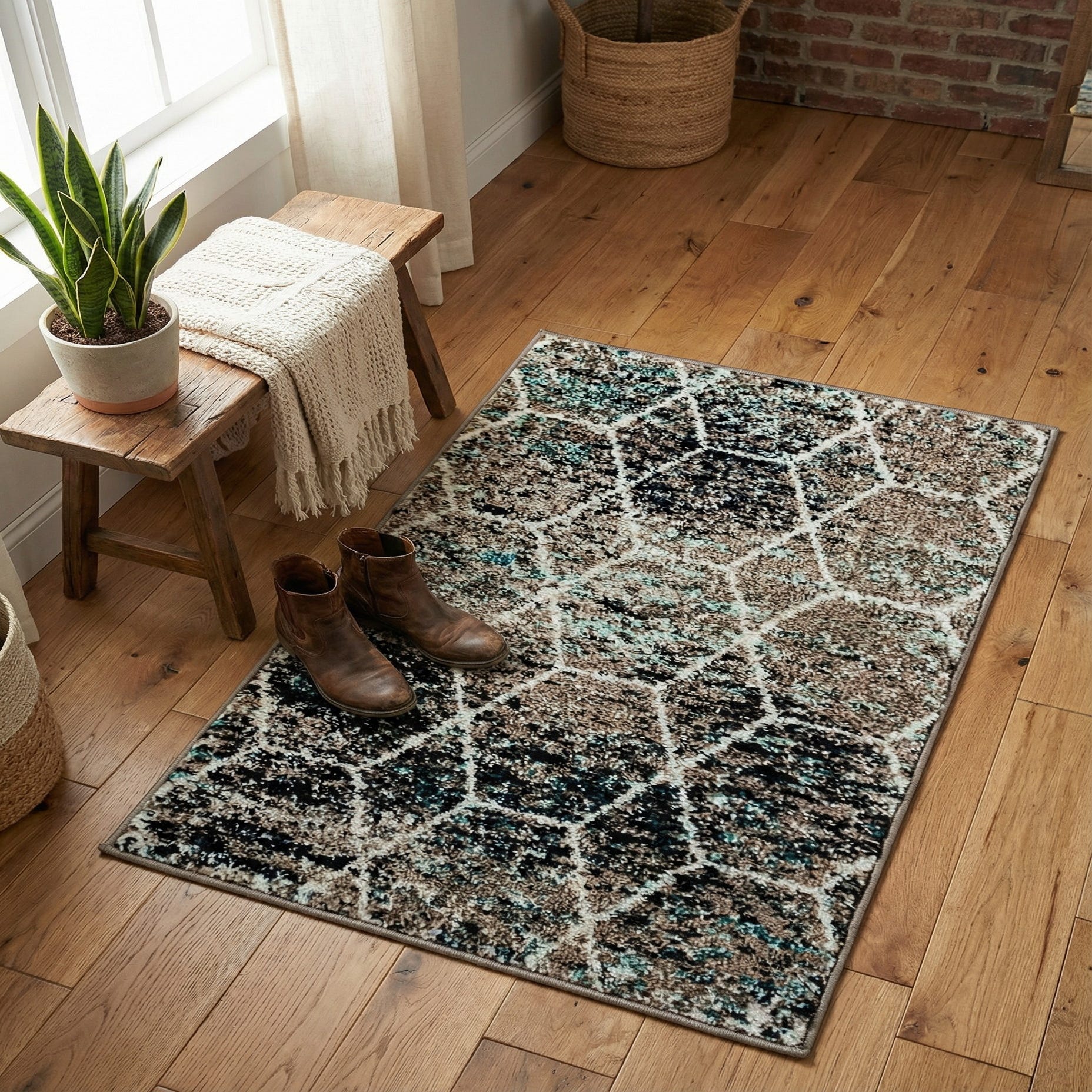 Primary color is Blue Multi. Colors in this rug include: Blue Multi, Ivory, Light Blue, Light Brown, Navy Blue, Turquoise.