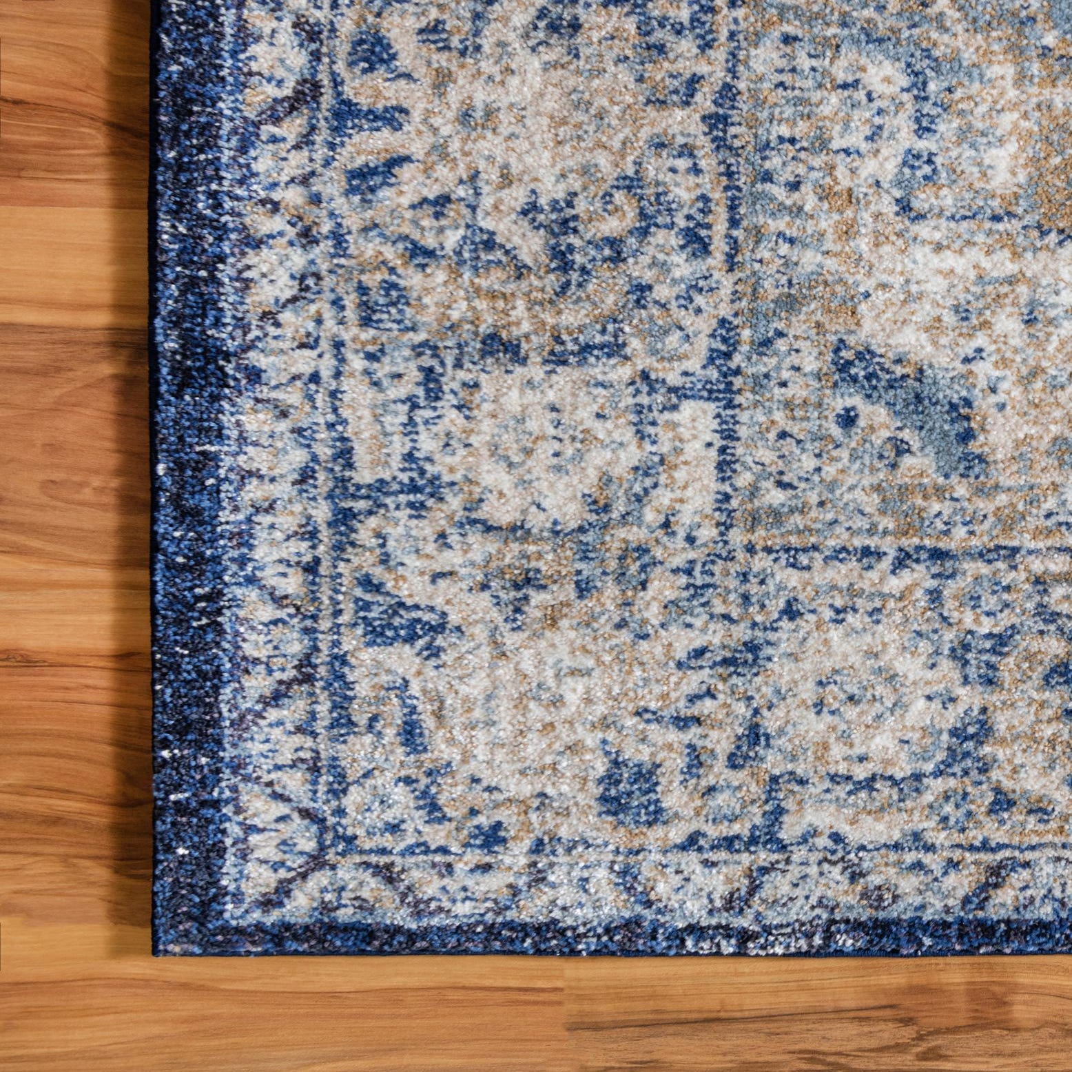 Primary color is Blue. Colors in this rug include: Blue, Ivory, Navy Blue, Tan.