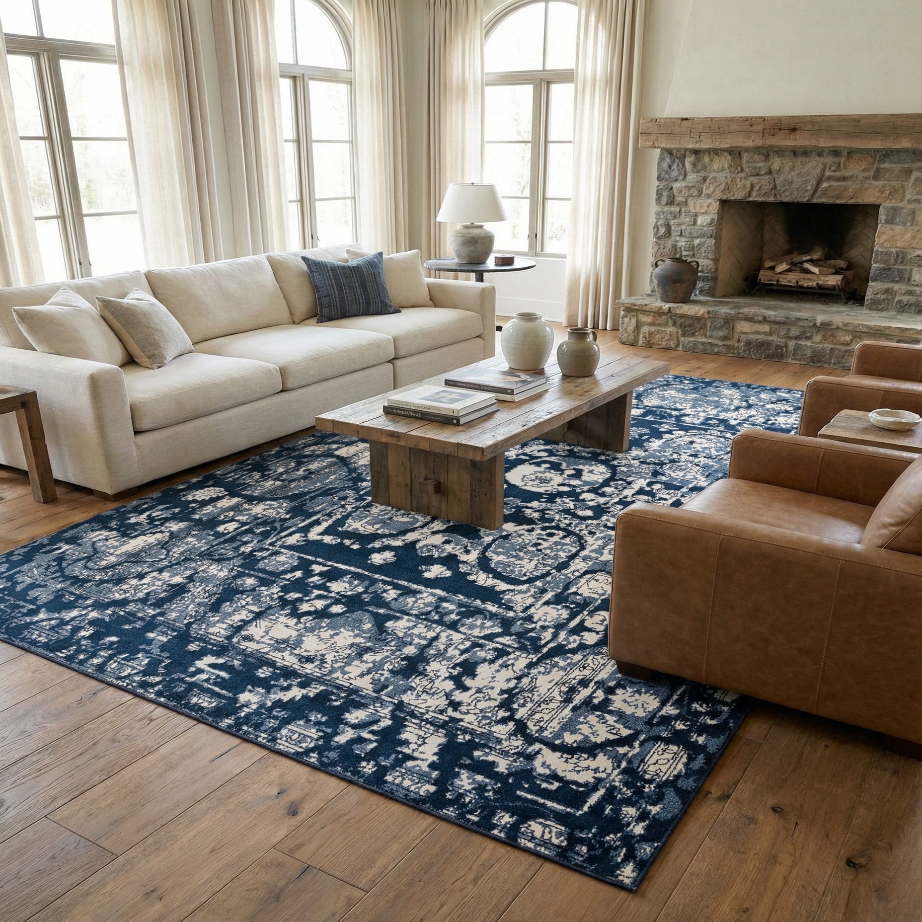 Primary color is Blue. Colors in this rug include: Blue, Ivory, Navy Blue, Light Blue.