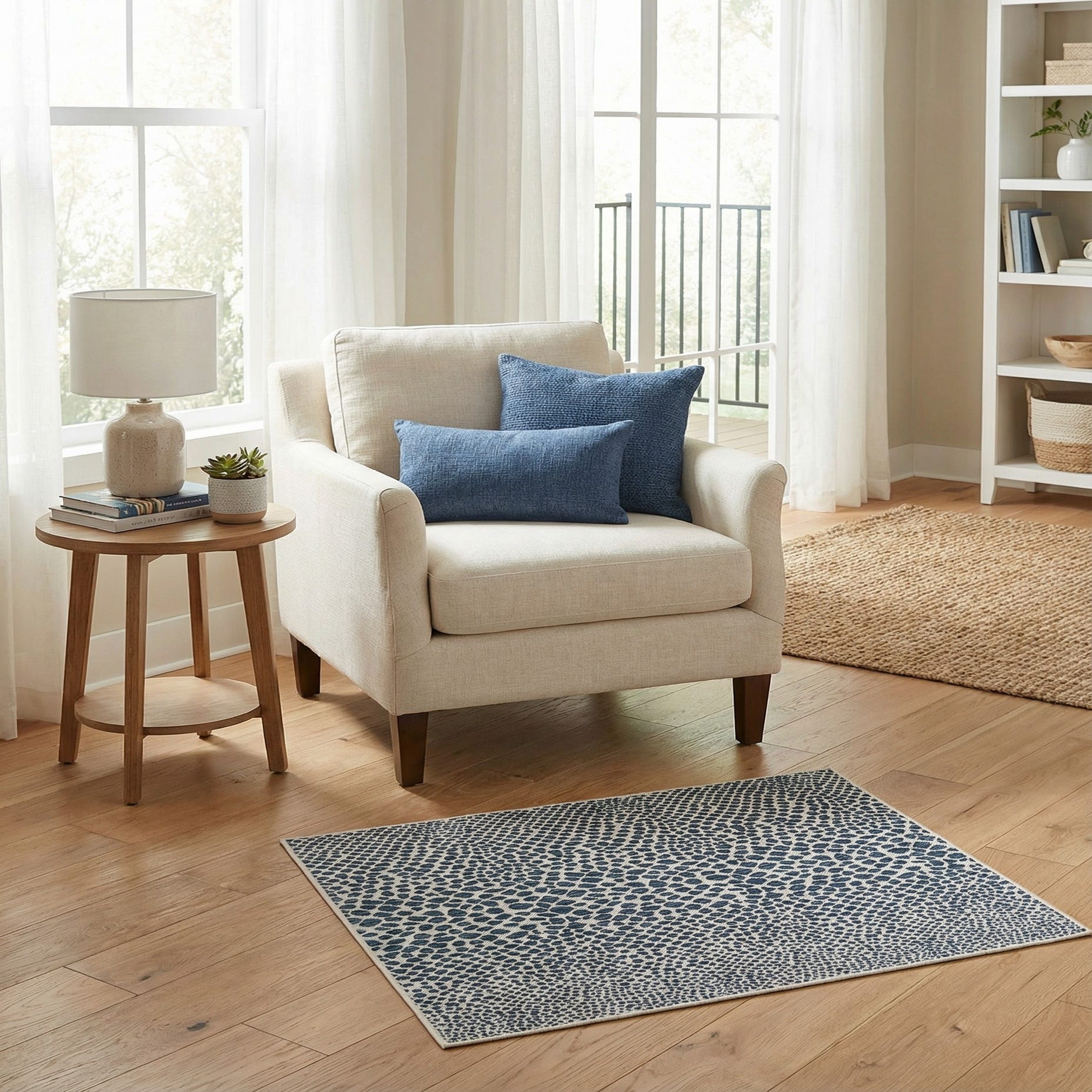Primary color is Blue. Colors in this rug include: Blue, Ivory.