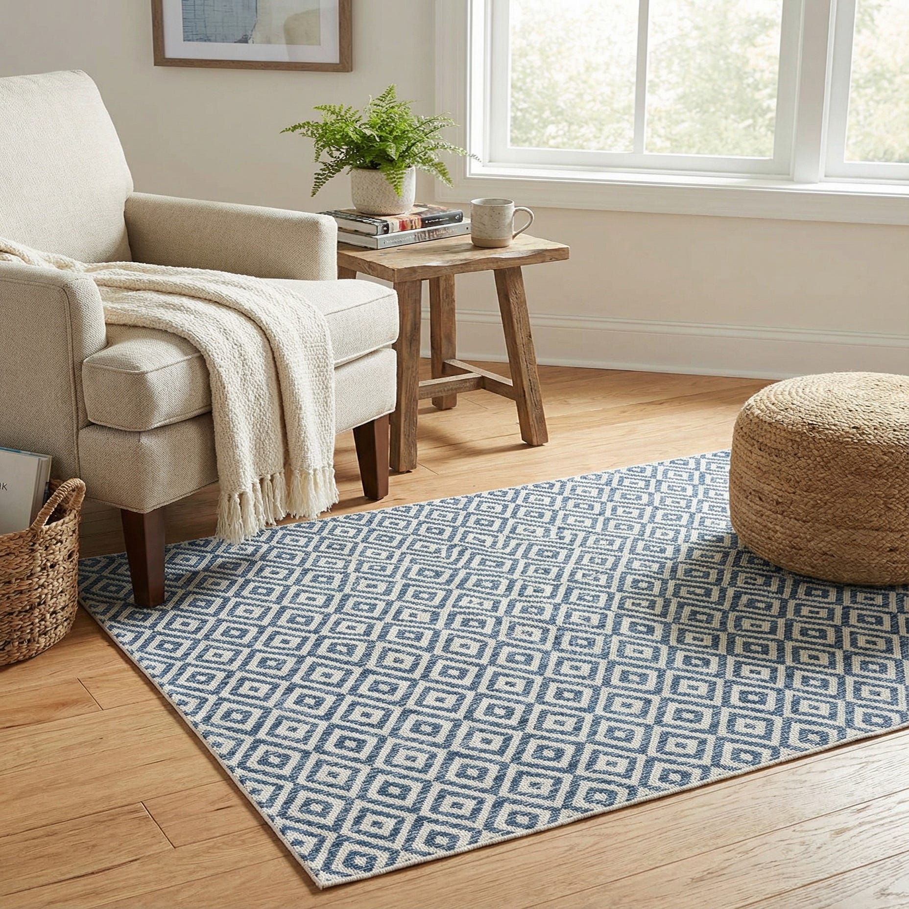 Primary color is Blue. Colors in this rug include: Blue, Ivory.