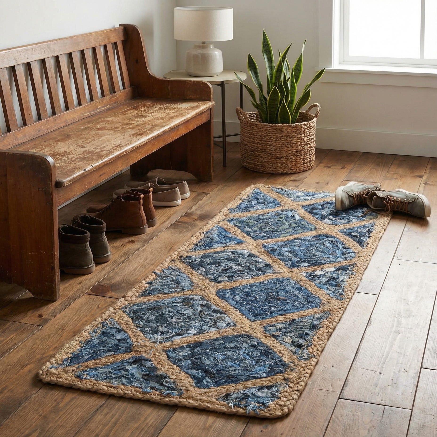 Primary color is Blue. Colors in this rug include: Blue, Natural.